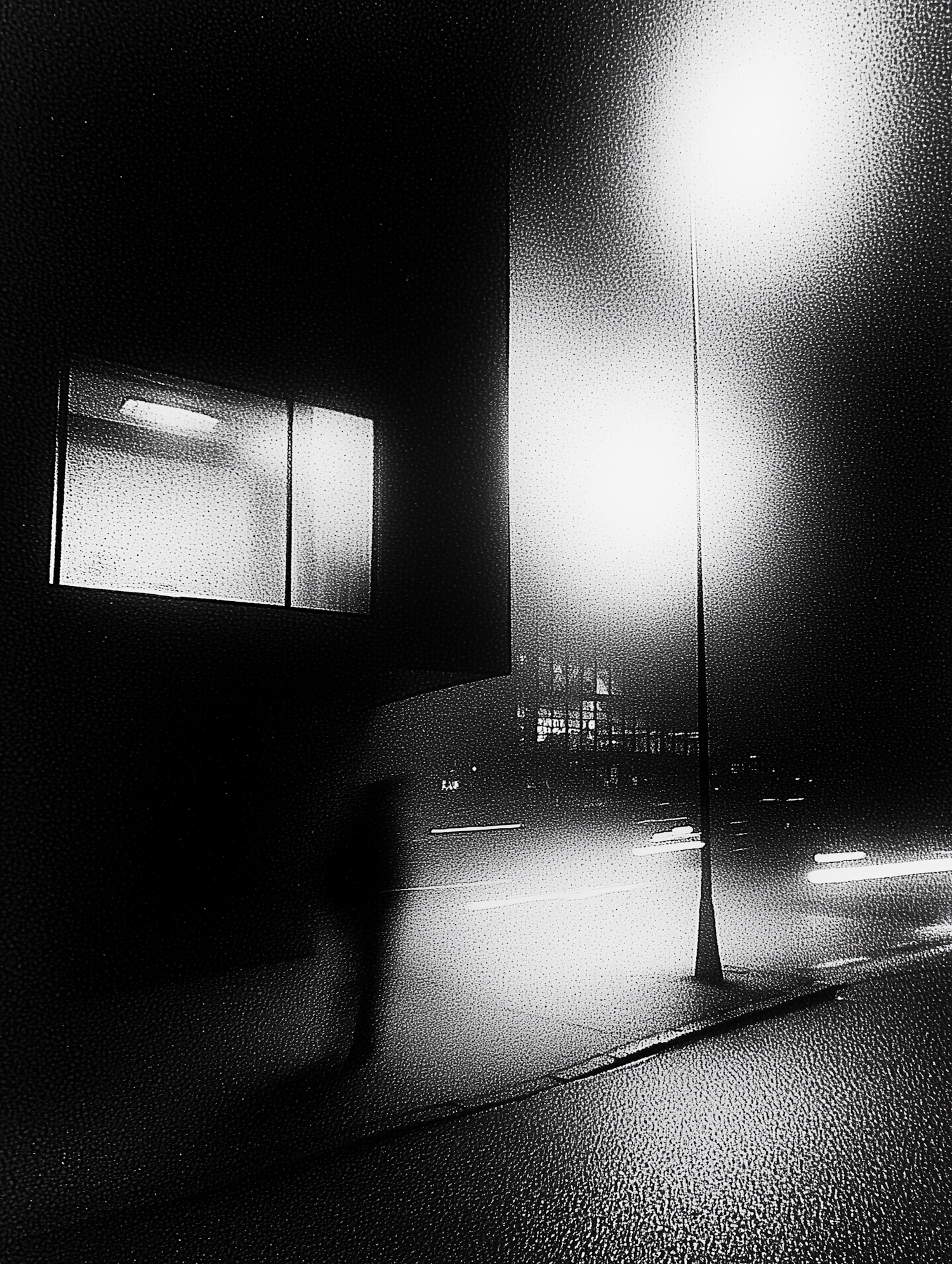 Moody black and white urban night scene with a blurred figure, streetlamp, and light trails, creating a mysterious atmosphere.
