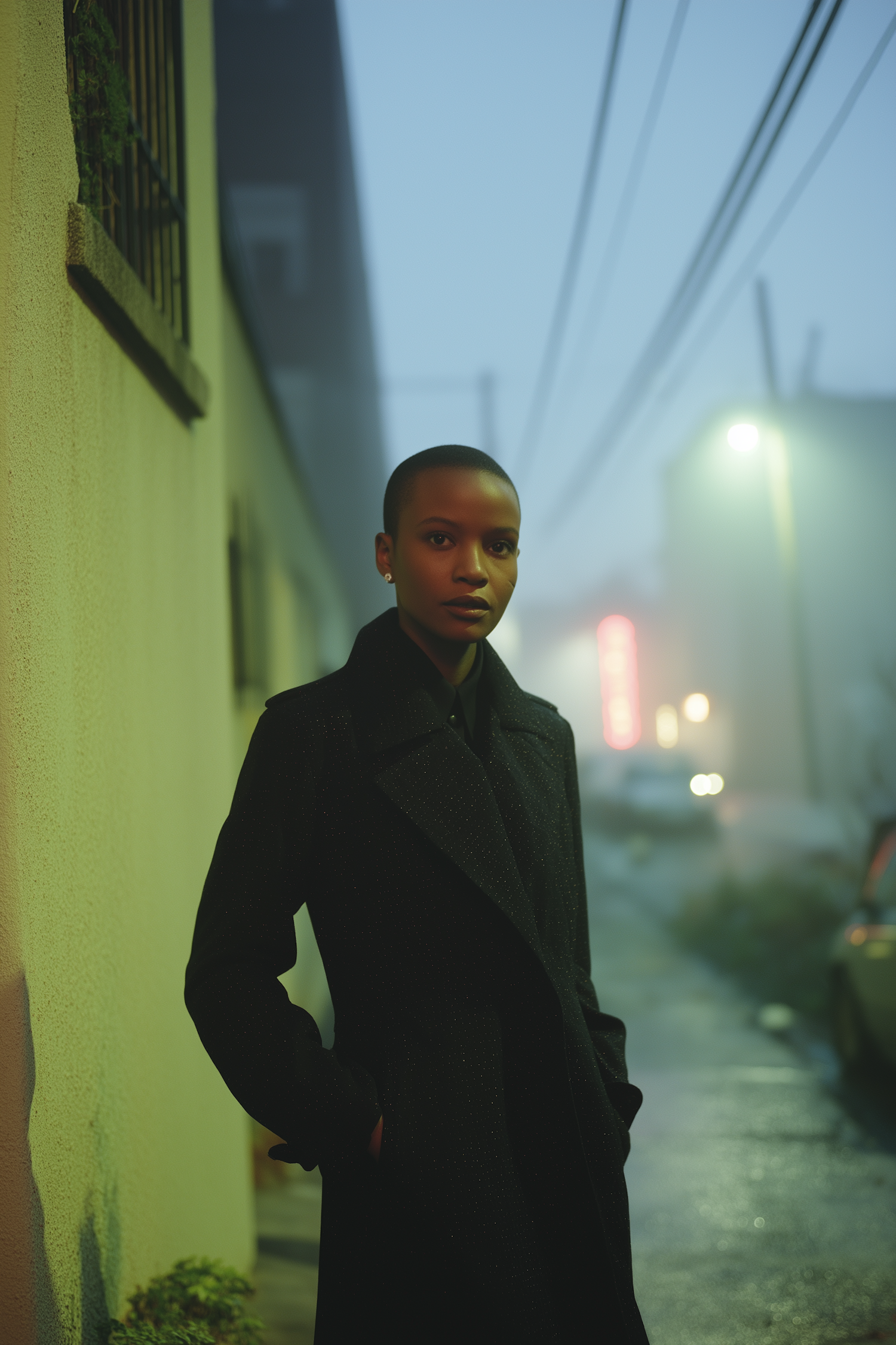 A person in a dark coat stands in a misty urban street, with soft lighting and a moody atmosphere enhancing the scene.