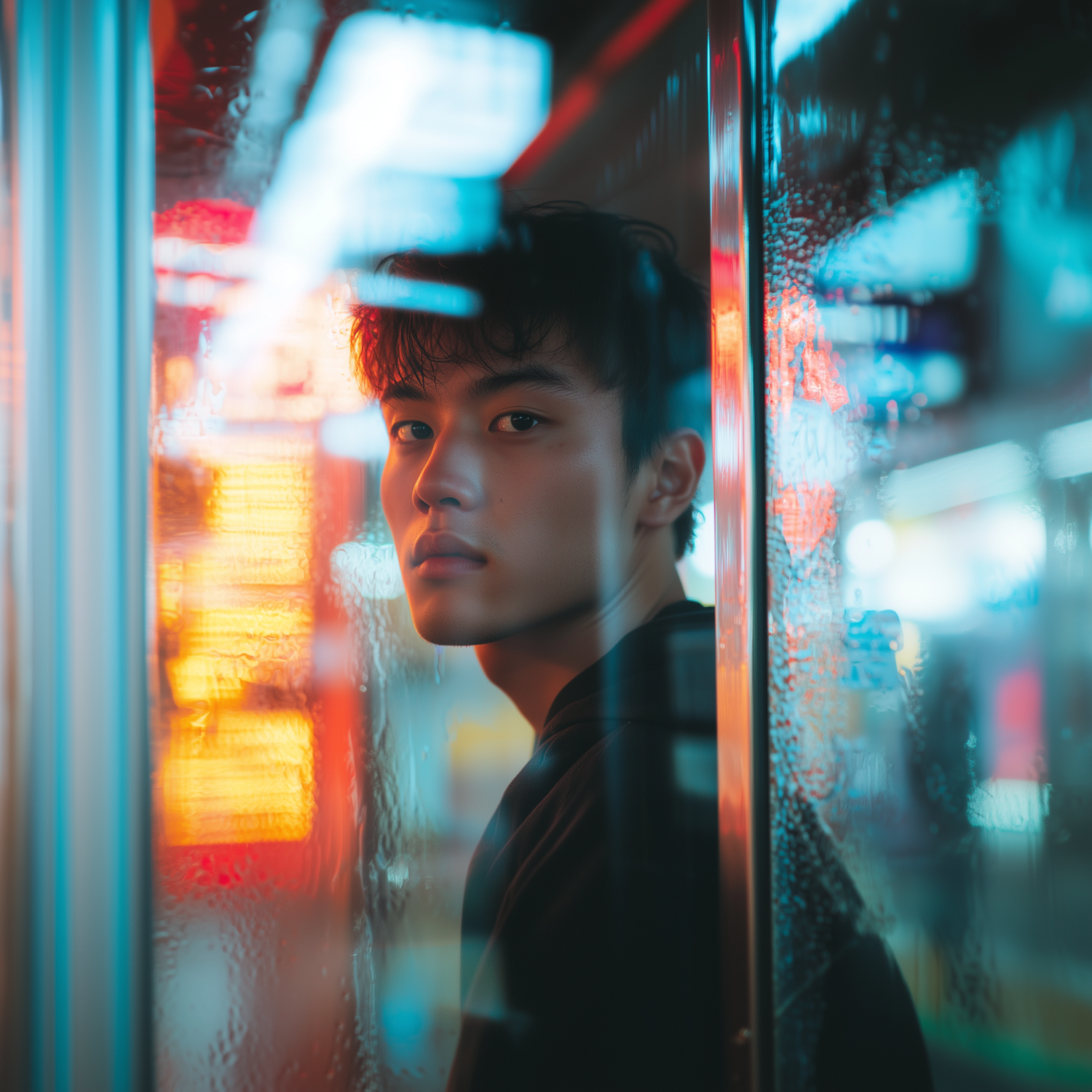 Moody portrait of a young man in an urban setting with neon lights and reflections on glass, creating a cinematic and introspective vibe.