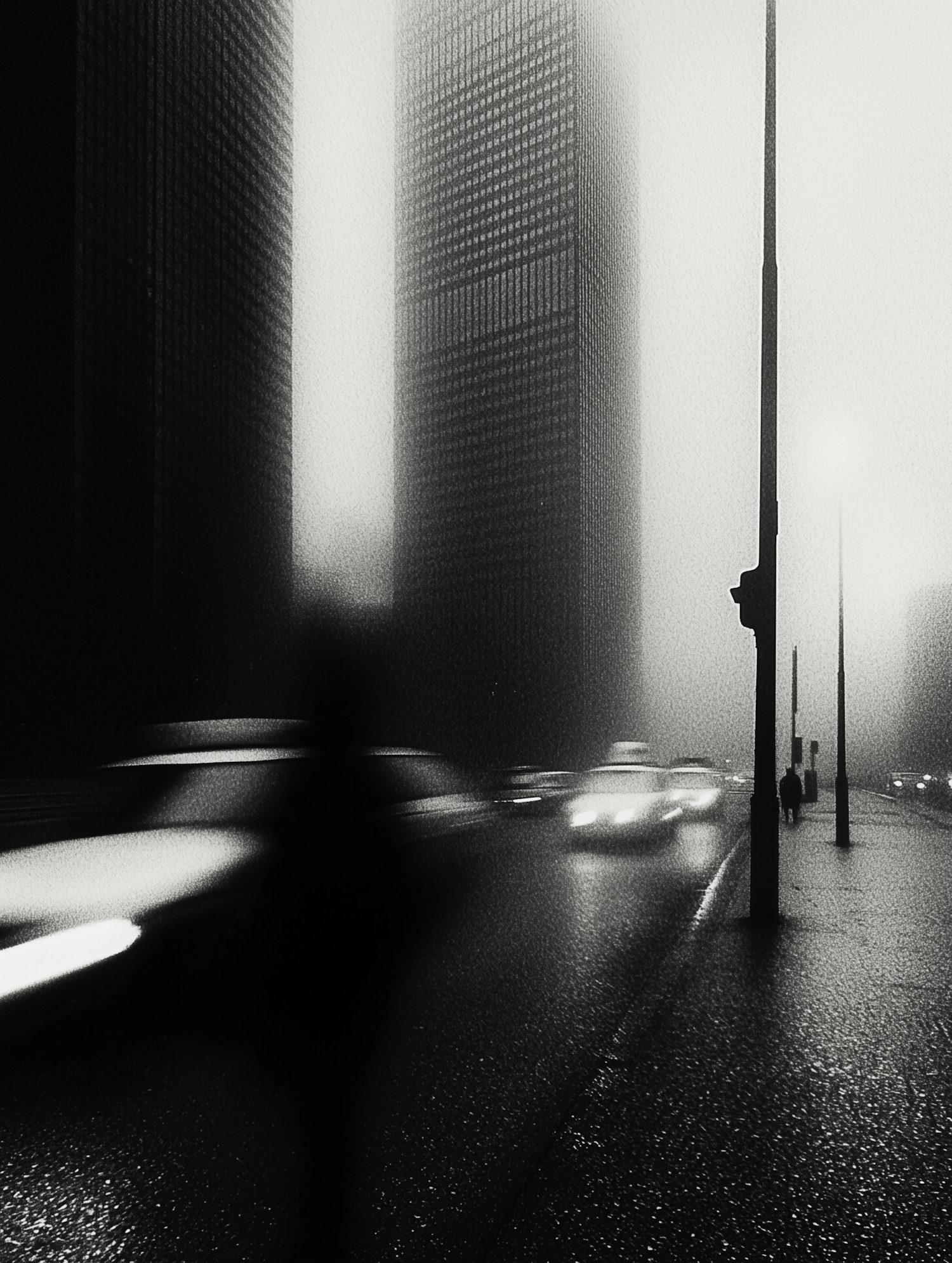 Monochrome urban scene with foggy skyscrapers, blurred cars, and a shadowy figure on a wet road, creating a mysterious atmosphere.