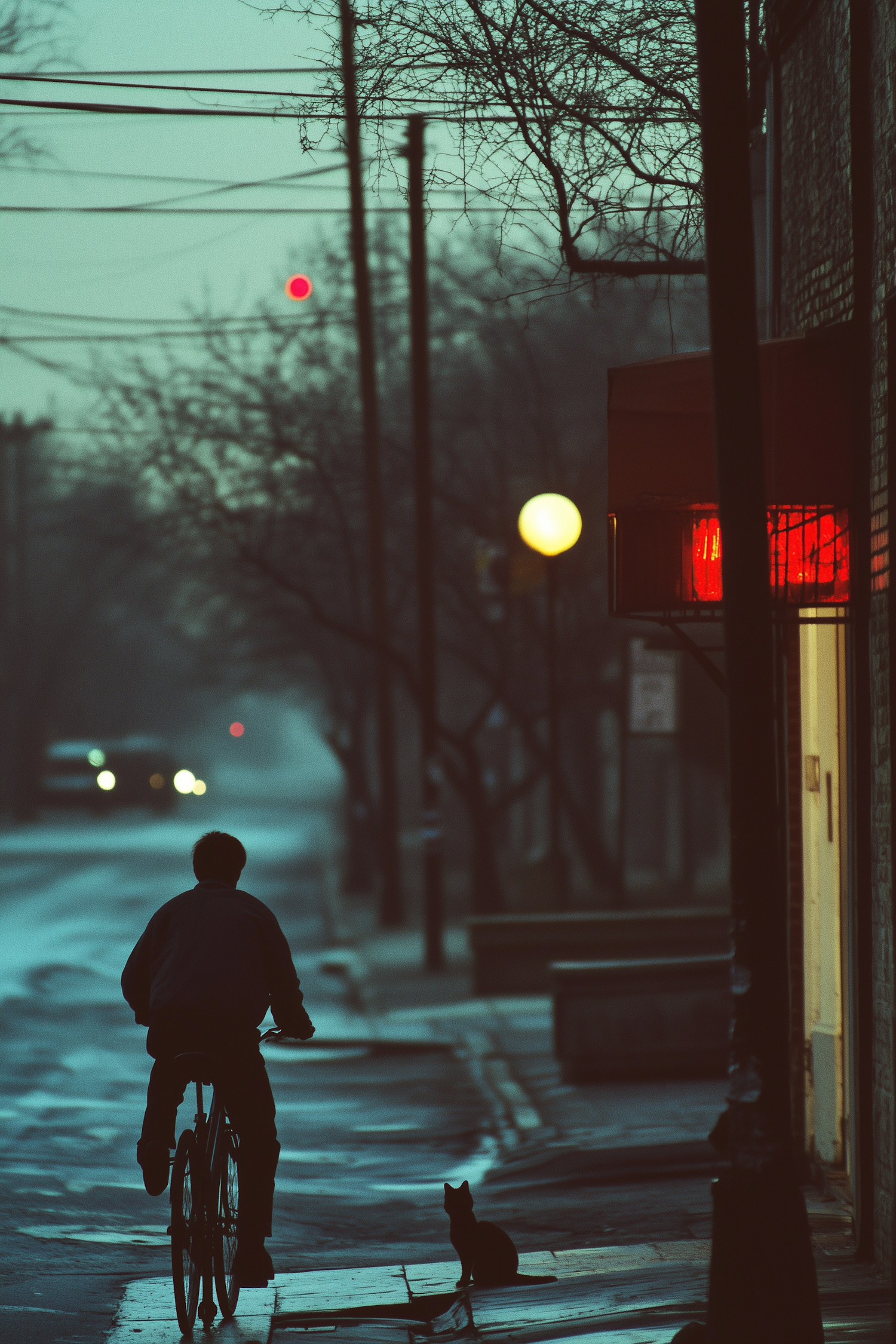 A cyclist rides down a quiet, wet street at dusk, with a black cat sitting nearby and glowing neon lights adding a moody urban vibe.