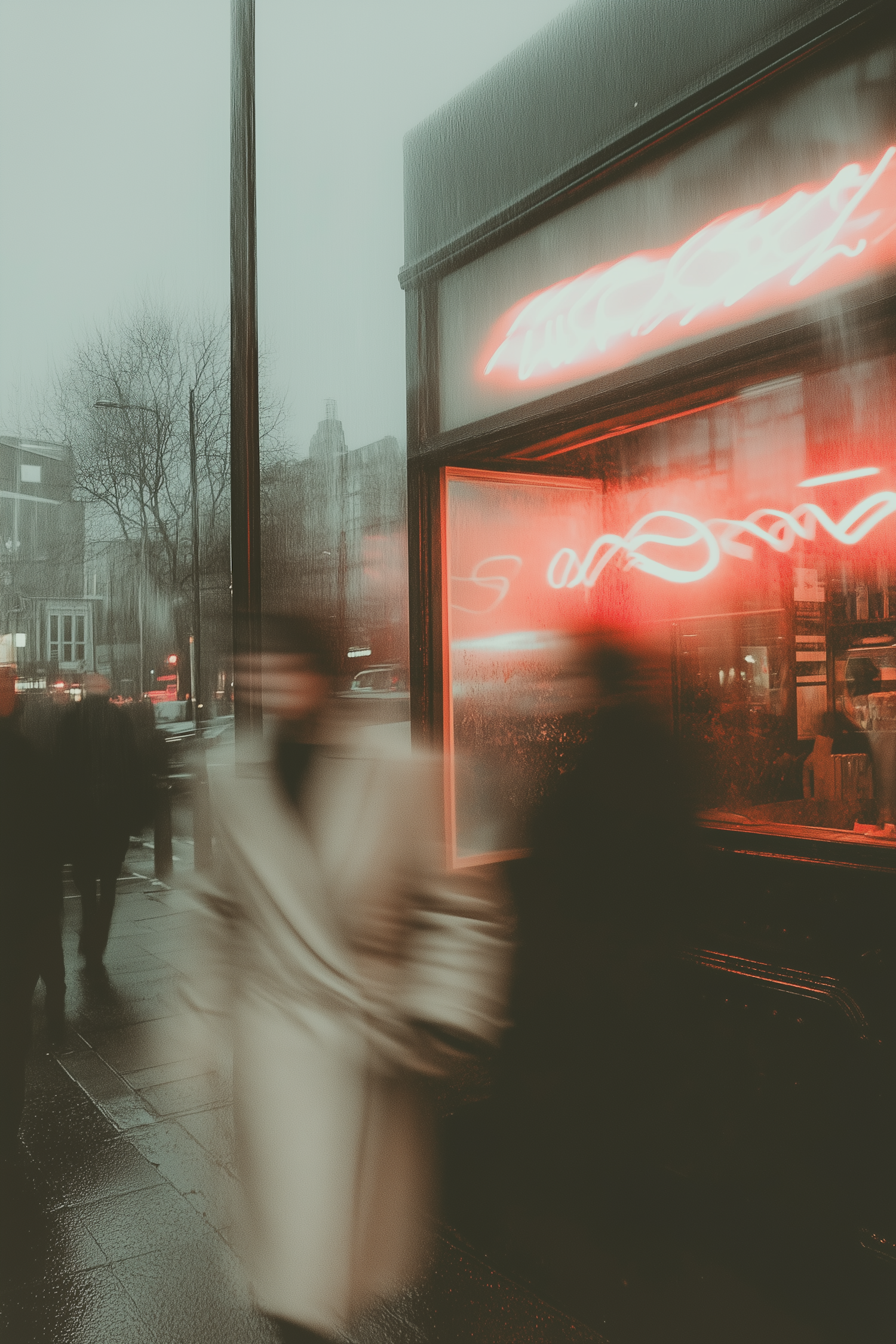 Blurred pedestrians pass a rainy city street with glowing red neon lights and wet pavement reflections, creating a moody urban vibe.