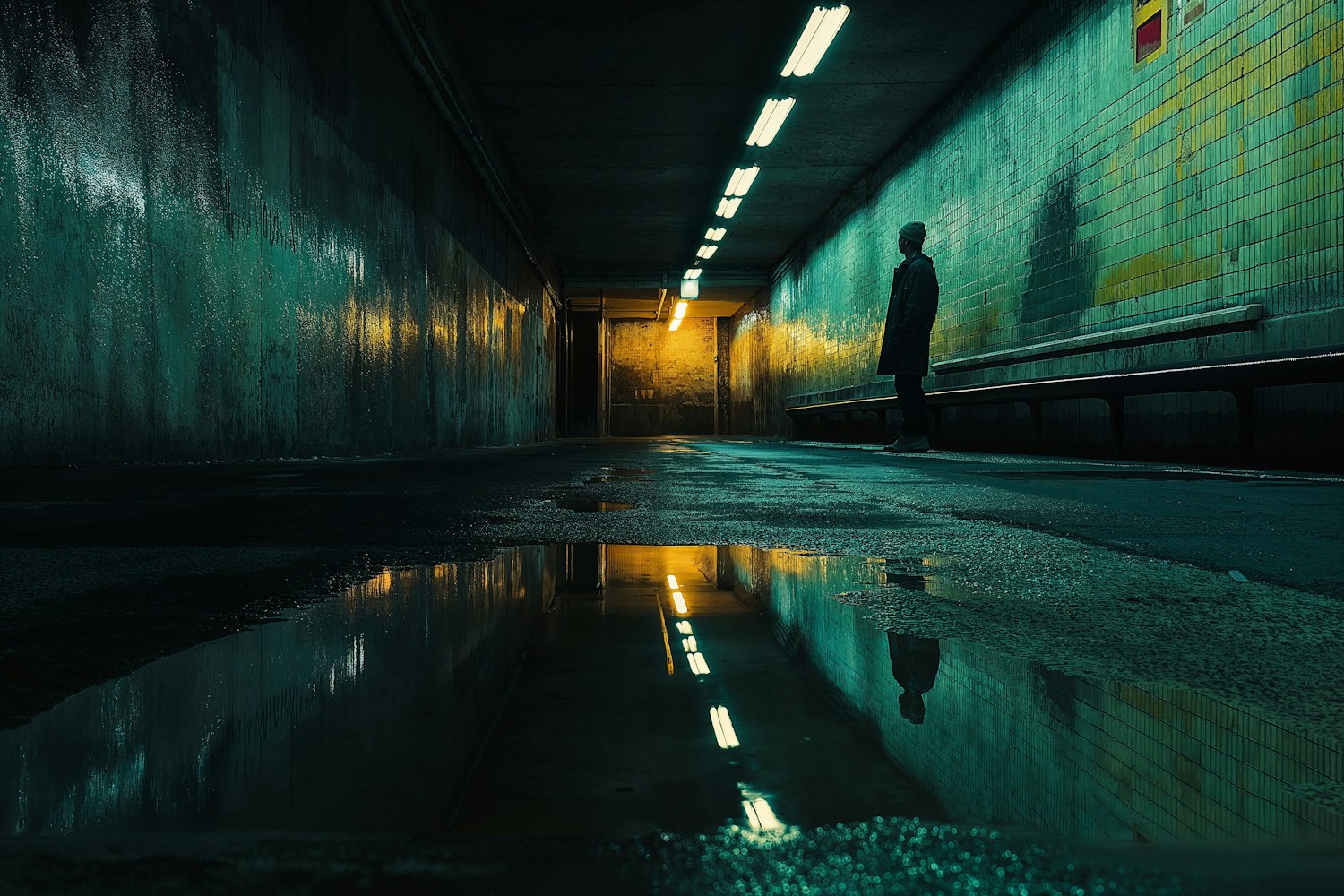 Moody urban underpass with green tiles, fluorescent lights, and a lone figure. Reflections in puddles add depth to the cinematic scene.