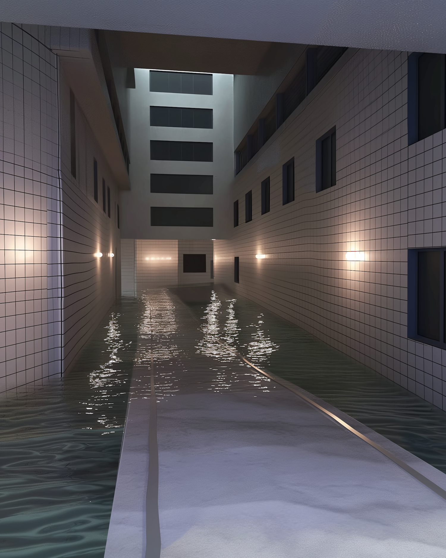 A dimly lit, flooded corridor with tiled walls and reflective water, creating a serene yet eerie atmosphere.
