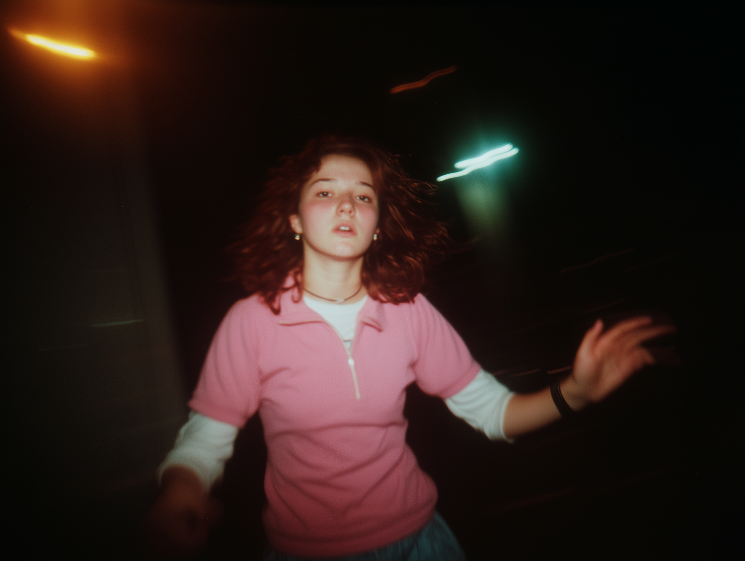 A young woman in a pink top and white undershirt moves dynamically in a dimly lit setting with blurred light streaks in the background.