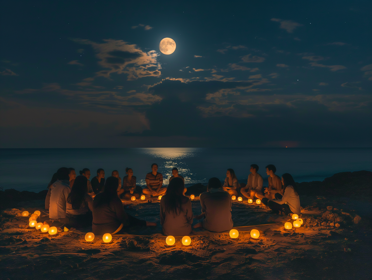 A serene beach gathering under a full moon, with people sitting in a circle surrounded by glowing lanterns.