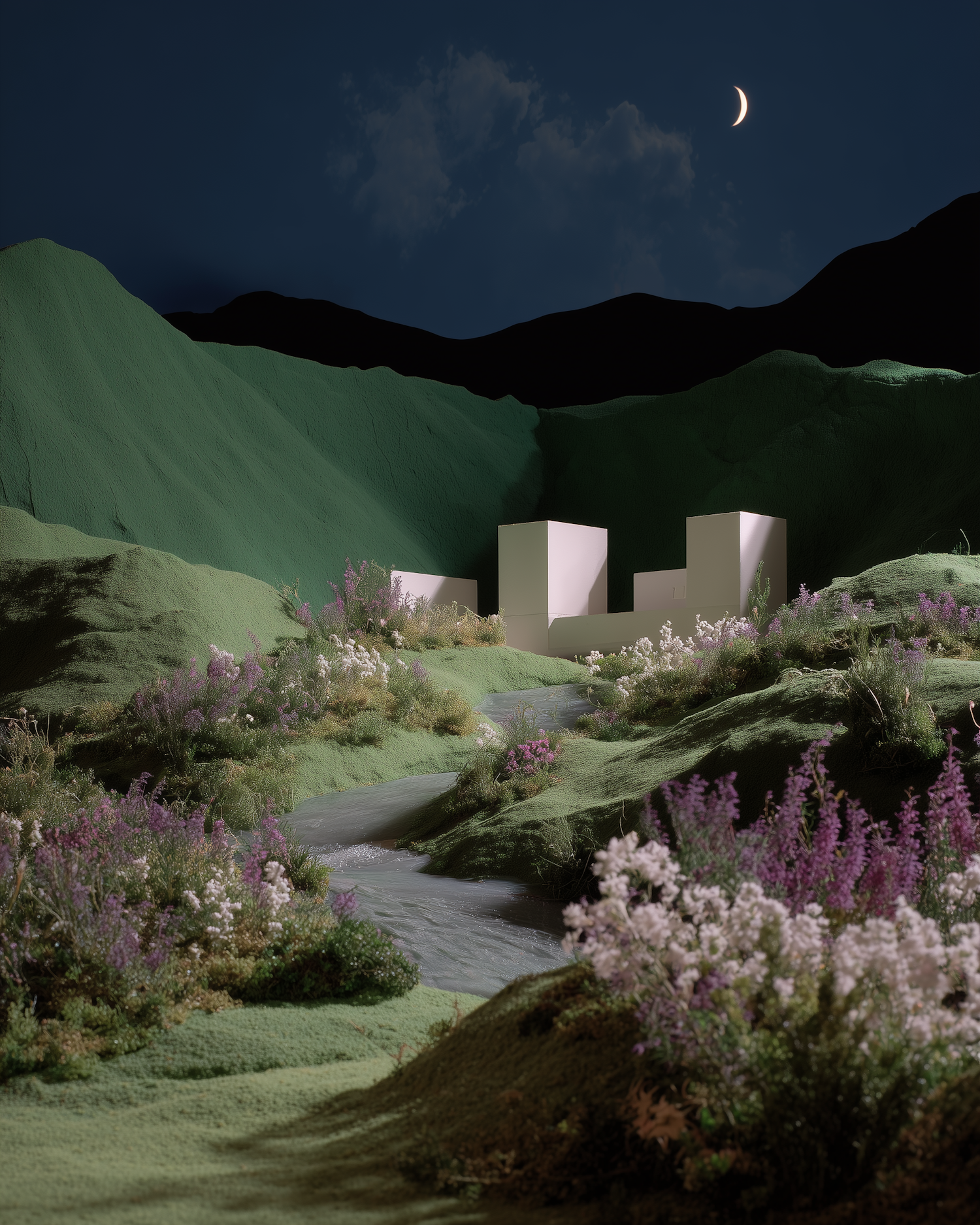 A dreamy nighttime landscape with rolling green hills, wildflowers, a winding stream, and minimalistic white cubic structures under a crescent moon.