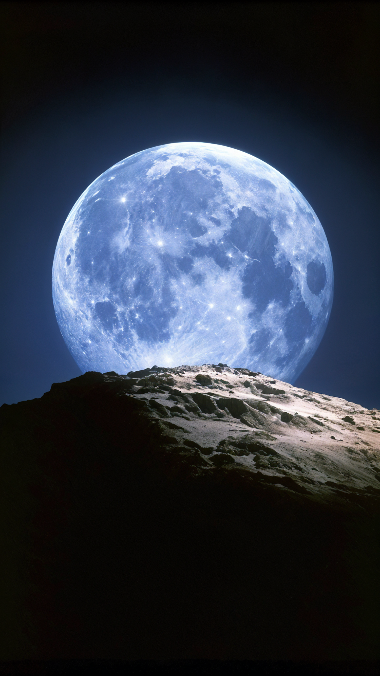 Majestic full moon rising over rugged rocky landscape, creating a stunning contrast with the dark, jagged terrain and deep blue sky.