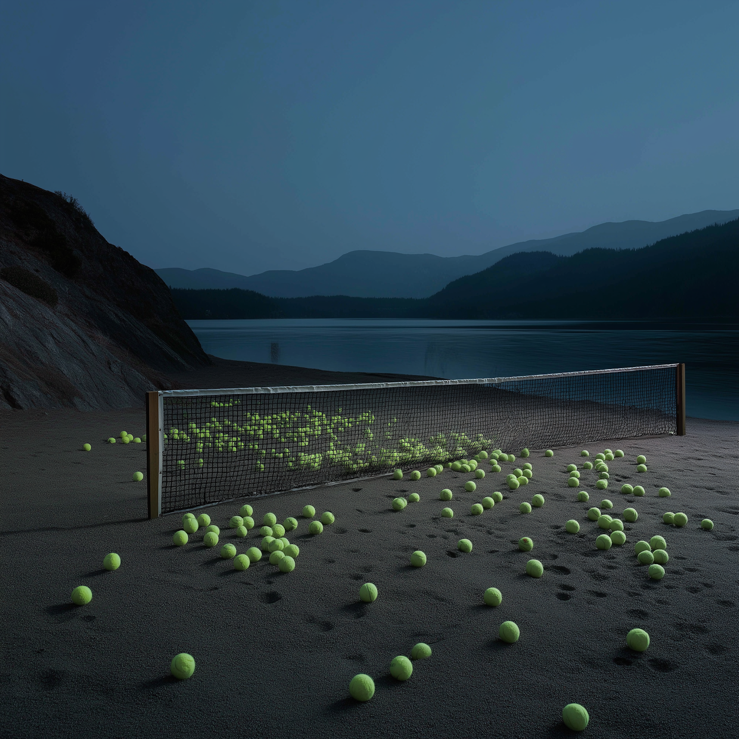 A tennis net on a moonlit beach, surrounded by scattered tennis balls, with a calm lake and mountains in the background.