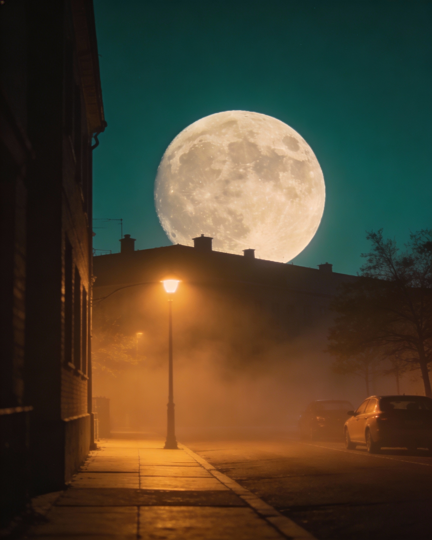 A giant moon appearing very close above a quiet city street, teal night sky with soft amber streetlights, gentle fog, dreamy cinematic framing. warm low contrast cinematic