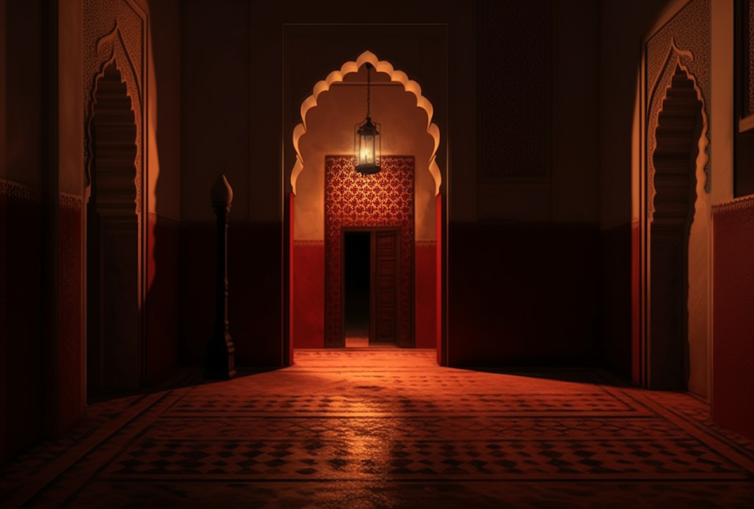 Dimly lit interior with ornate archway, warm lantern glow, and intricate patterns. Rich reds and browns create a cozy atmosphere.