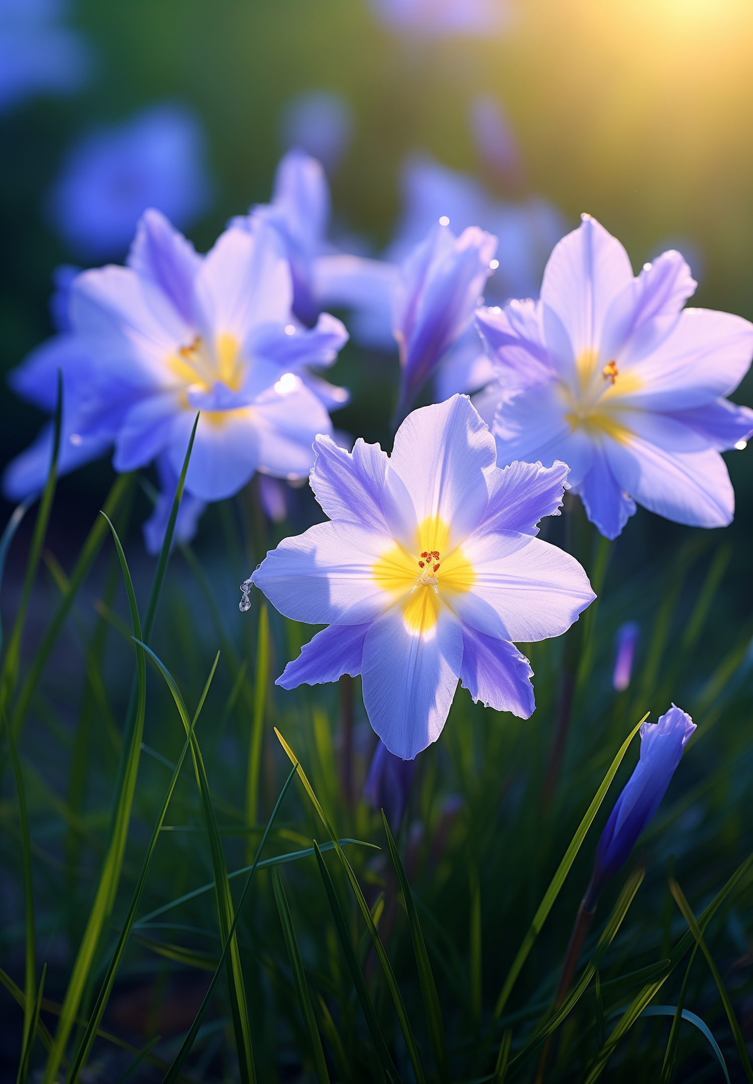Beautiful light purple flowers with yellow centers in a sunlit garden, surrounded by lush green grass and dewdrops.