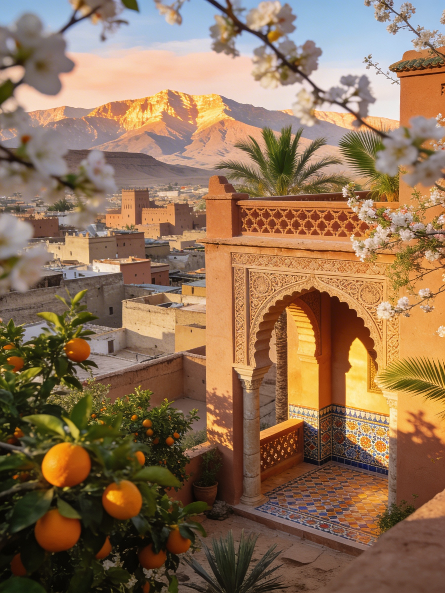 Ultra-realistic high-resolution travel photograph from a slightly elevated perspective, capturing an iconic Moroccan landscape with flowering orange trees and desert plants in the foreground, a terracotta riad terrace with carved arches and mosaic tiles, and the Atlas Mountains rising in the distance. Warm golden-hour sunlight creates crisp highlights and realistic shadows across clay walls, patterned tiles, palm leaves, and flowering branches. The foreground is framed by softly out-of-focus citrus blossoms and branches, leading the eye toward the richly detailed riad architecture on the right and the historic medina below. In the distance, the mountains glow beneath a pale peach and light blue sky. The overall palette is warm and natural, with terracotta clay, sandy beige stone, green palm leaves, soft blossom whites, and golden sunlight. Ultra-detailed, photorealistic, sharp textures, realistic atmospheric depth, natural color grading, editorial travel photography, shot on a full-frame camera, magazine-quality realism, no painting, no illustration, no CGI. Extremely realistic travel photography, crisp fine detail, realistic shadows, true-to-life color, sharp architectural textures, natural optical depth, high-resolution full-frame camera image.