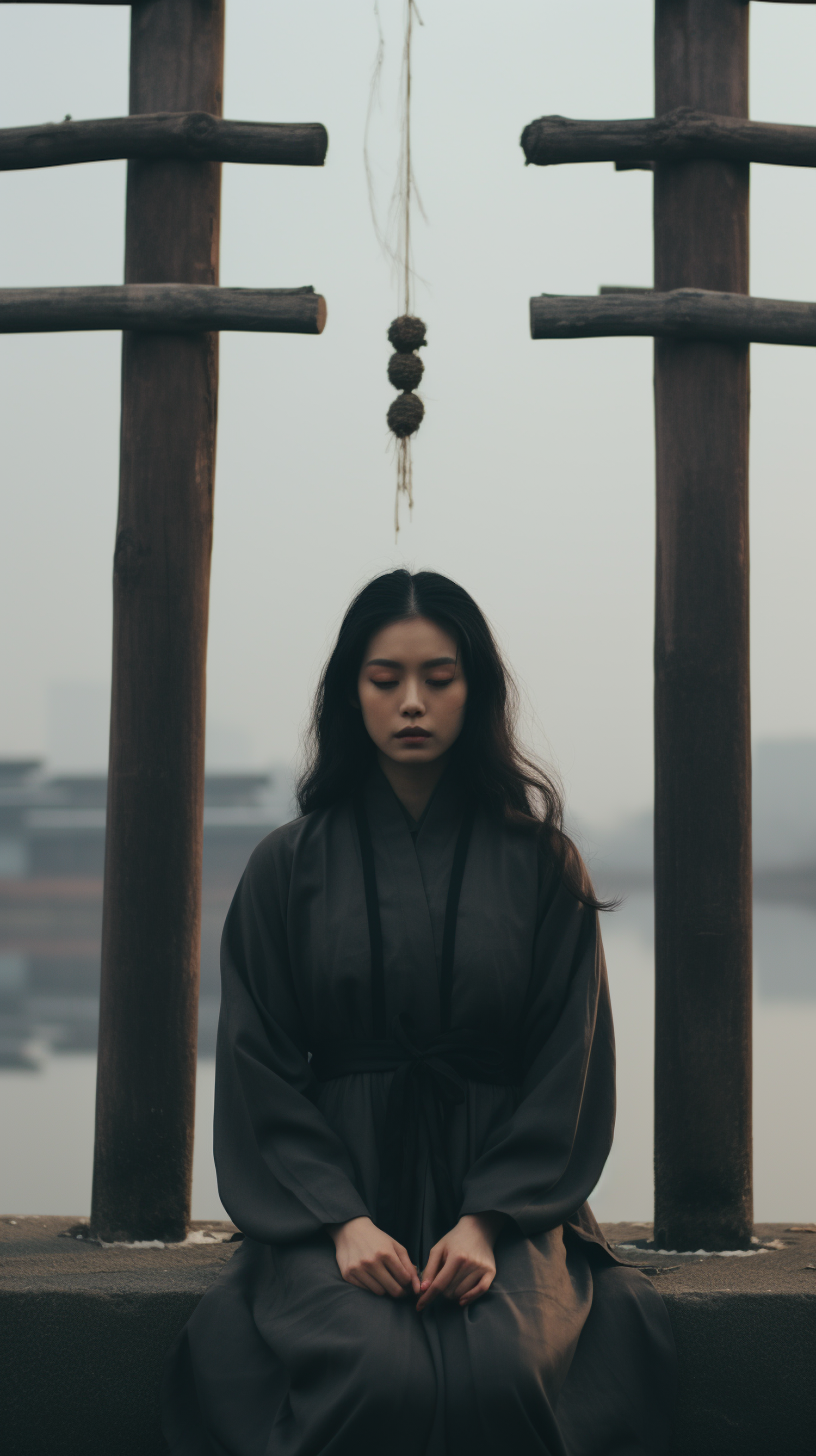 Serene Asian woman in dark robe meditating outdoors, surrounded by wooden structures and misty landscape.
