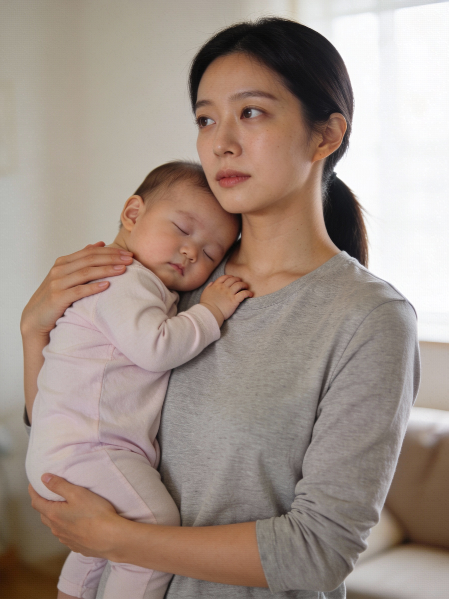 Studio portrait at home of a Korean female mother in her early 30s holding her baby upright against her shoulder; light skin, neutral undertone; straight dark hair in a low ponytail; light gray long-sleeve t-shirt, no logos. She stands slightly angled to the camera with her 7–9-month-old baby in a soft pastel onesie resting against one shoulder, the baby’s head and upper back visible; her opposite hand gently pats or supports the baby’s back. Soft natural window light from the side; shallow depth of field; background is a blurred cozy apartment interior with pale walls and a hint of a sofa, gentle bokeh. The mother looks off slightly to the side with a calm, thoughtful expression; the baby’s face is turned toward the camera with a relaxed, sleepy or just-woken expression, one hand resting on her shoulder. Portrait orientation, 3:4 ratio, mid-chest-up composition; subjects centered, camera at adult eye level; full head and hair of the mother and baby’s head fully inside the frame with a little space above; both shoulders and her supporting hand clearly visible.