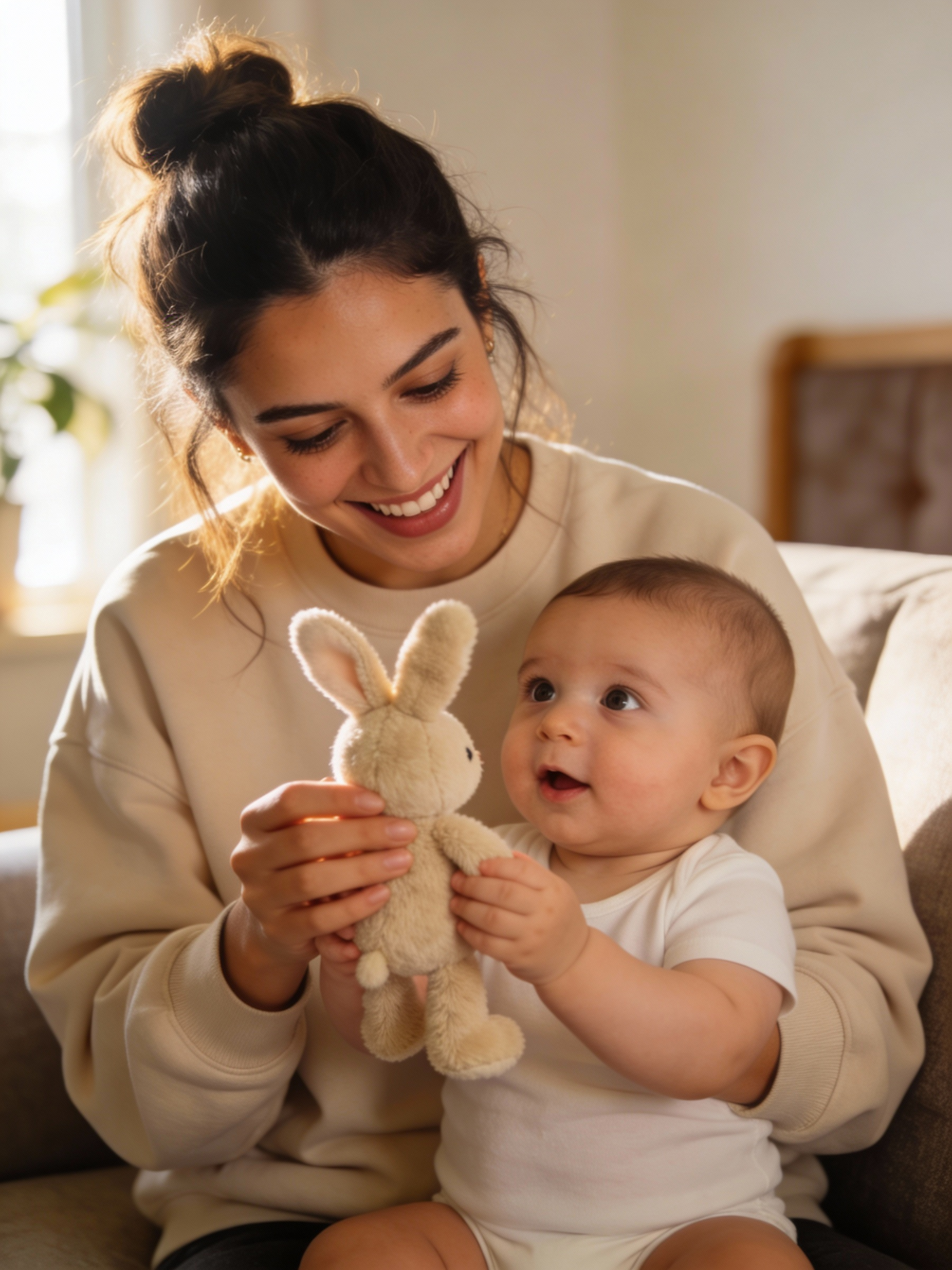 Studio portrait at home of a Turkish female mother in her early 30s playing with her baby; light olive skin, warm undertone; long dark hair in a loose messy bun; soft beige sweatshirt, no logos. She sits on a sofa turned slightly toward her 9-month-old baby, who is sitting upright beside her in a simple white onesie, only the upper body visible. The mother holds a small beige plush bunny just above the baby’s hands, guiding it toward the baby. Soft natural window light from the side; shallow depth of field; background is a blurred cozy living room with light walls, sofa backrest and a plant, creamy bokeh. The mother looks at the baby with a big, genuine smile, mid-laugh; the baby looks at the plush toy with wide, curious eyes and slightly open mouth. Portrait orientation, 3:4 ratio, mid-chest-up composition; both mother and baby centered, camera at eye level; full heads of both entirely inside the frame with a little space above; both of the mother’s shoulders visible, plush toy clearly in frame, no cropping at the top or sides.