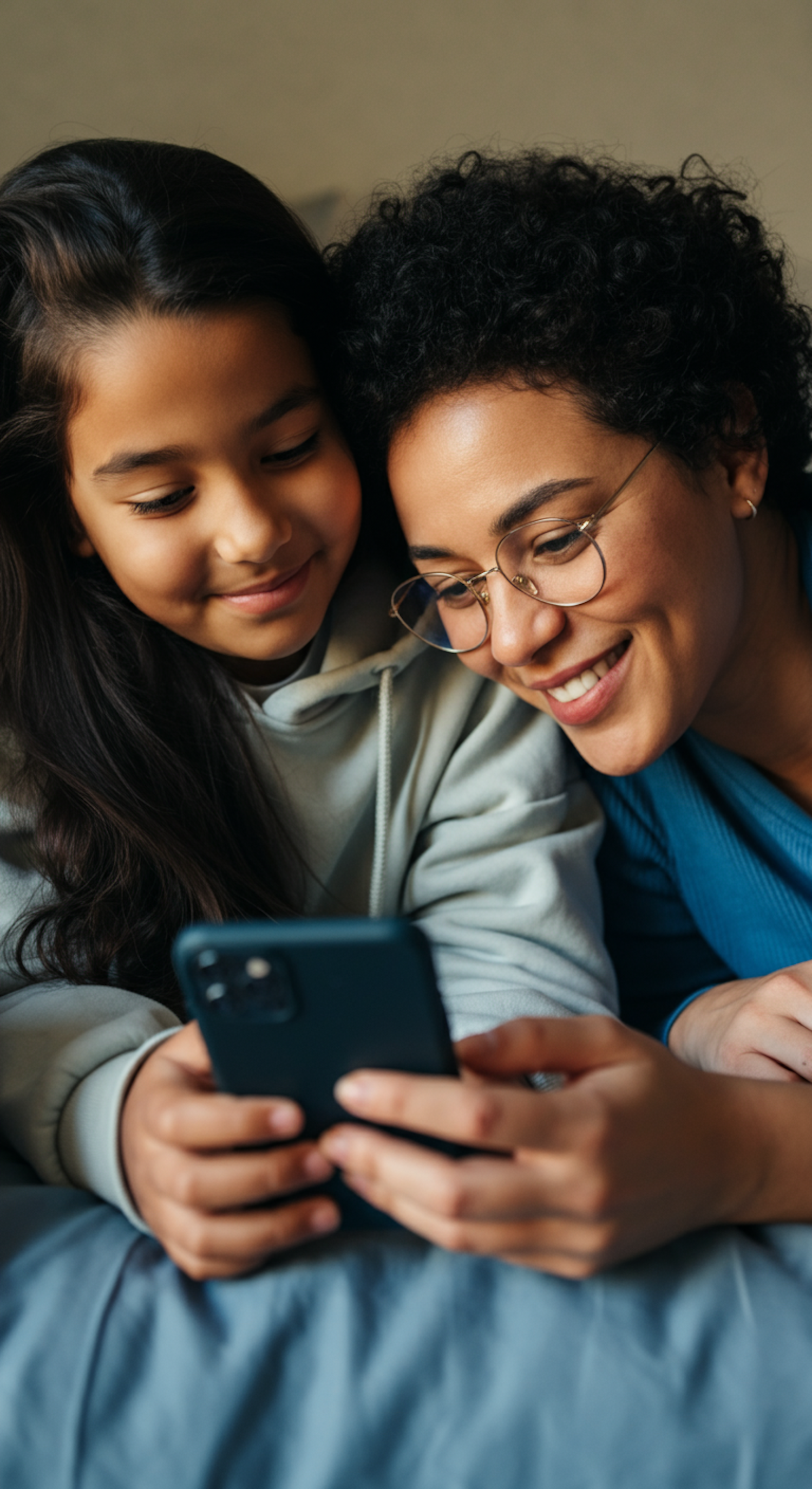 A young girl and a woman share a warm moment, smiling as they look at a smartphone together. Perfect for family or tech-related themes.