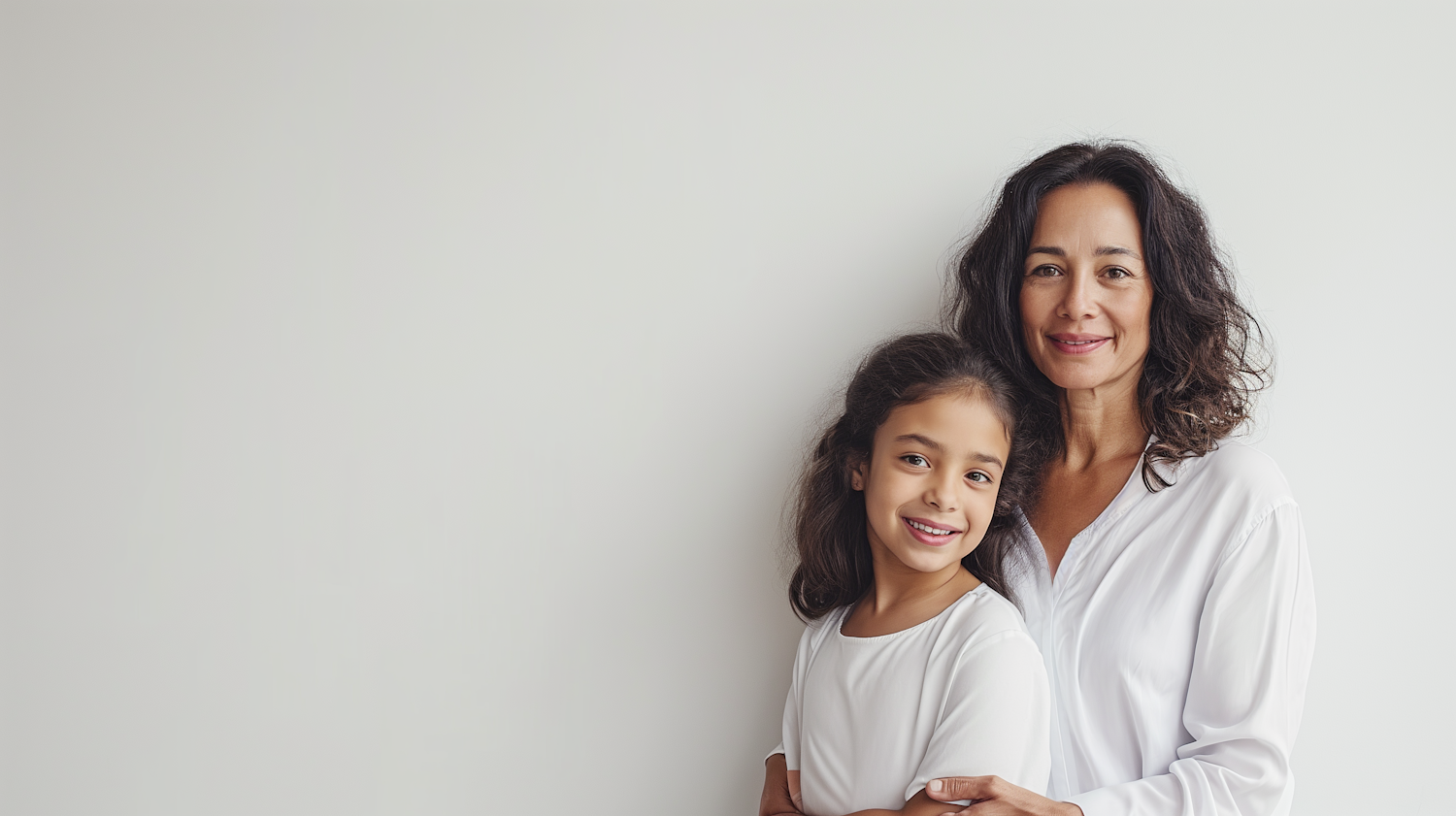 Mother and daughter in white tops, smiling warmly against a plain background, showcasing a strong familial bond.