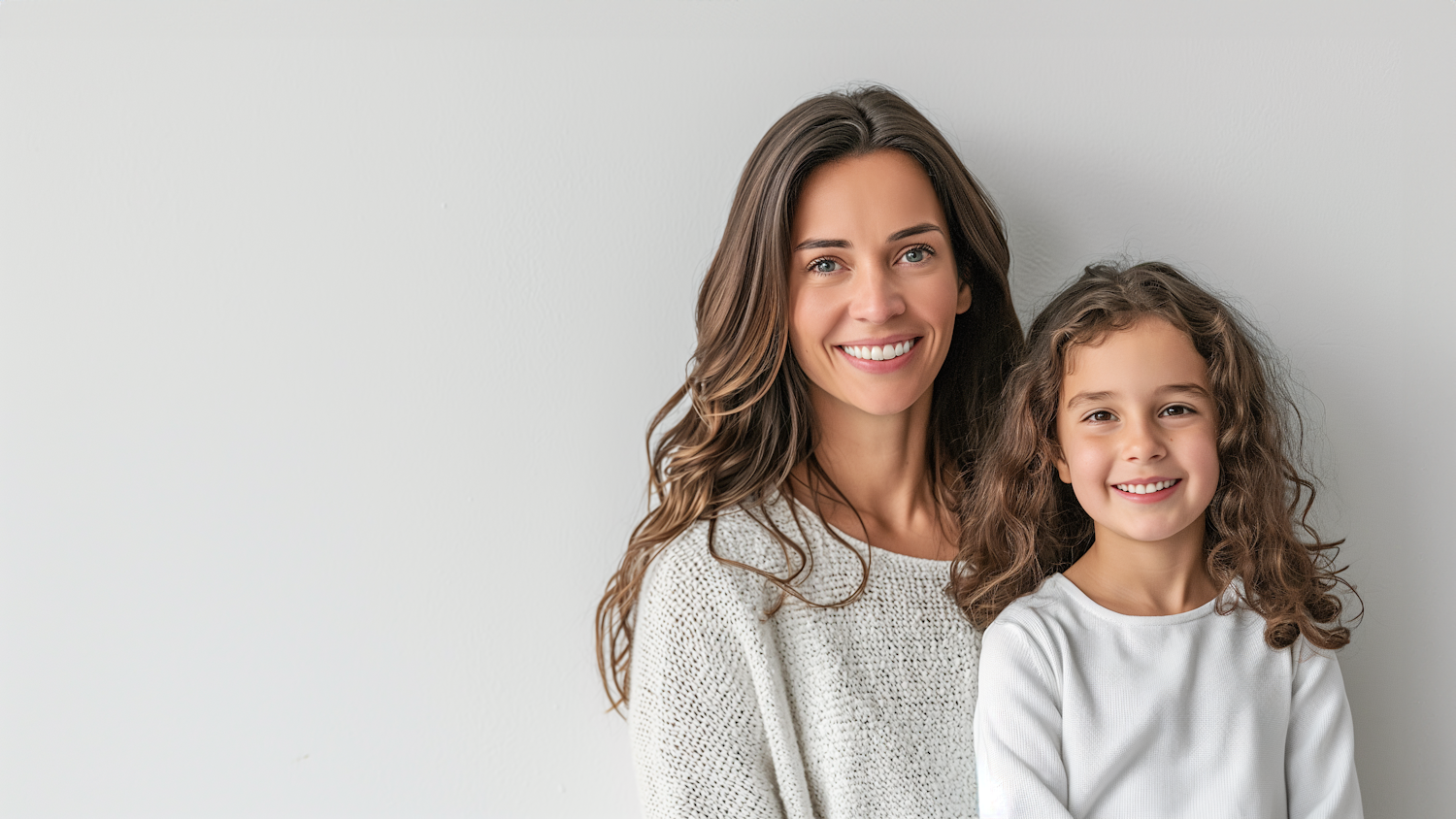 Smiling woman with wavy brown hair and young girl with curly hair against a light gray background, radiating warmth and joy.