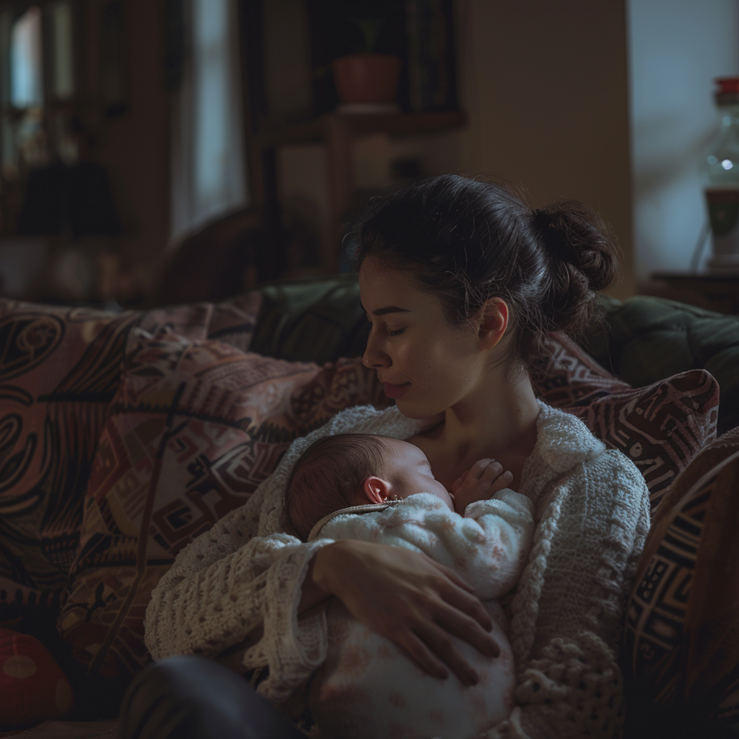 A young woman peacefully cradles a sleeping baby on a cozy couch, wrapped in a soft blanket, in a warmly lit room.