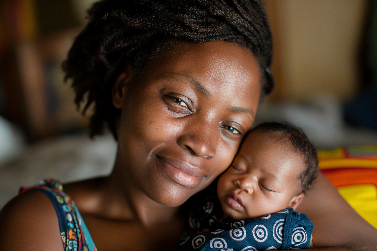 A loving mother holds her sleeping baby close, both with serene expressions, capturing a tender moment of connection and warmth.
