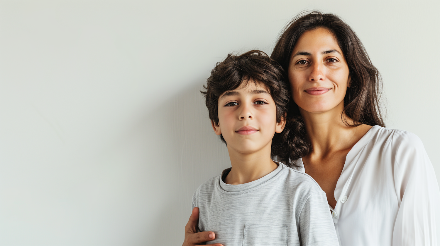 A woman and young boy stand together, smiling gently against a white background, suggesting a familial bond.