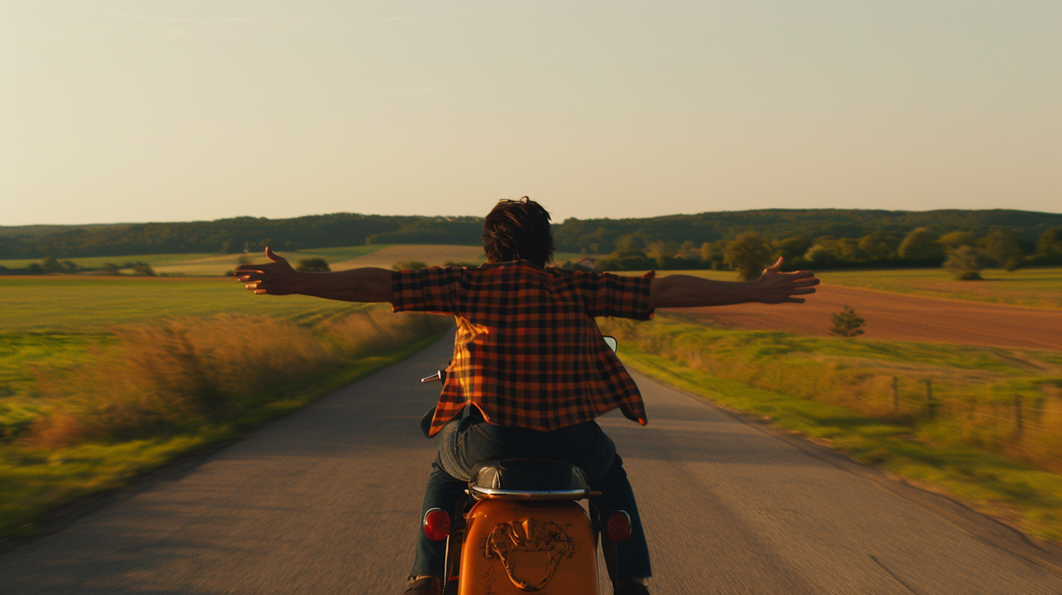 Person on a yellow motorcycle rides freely with arms outstretched on a rural road, surrounded by green fields and a clear sky.