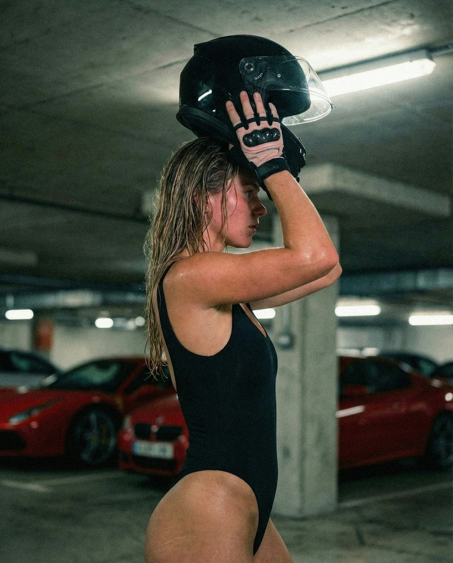 A woman in a black outfit holds a motorcycle helmet in a parking garage with red sports cars in the background.