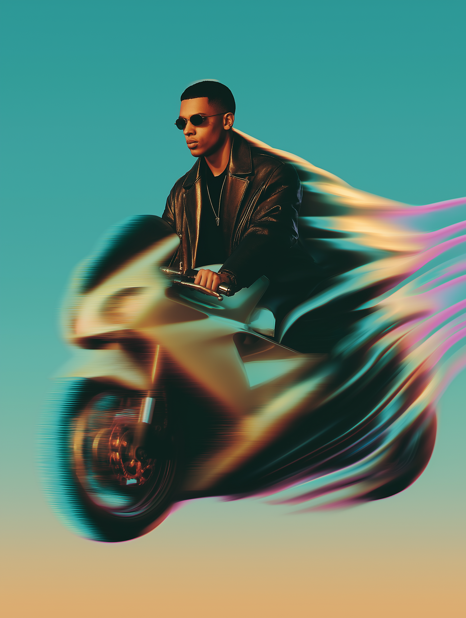 A stylish man on a motorcycle with dynamic light trails, set against a vibrant gradient background, creating a sense of speed and modernity.