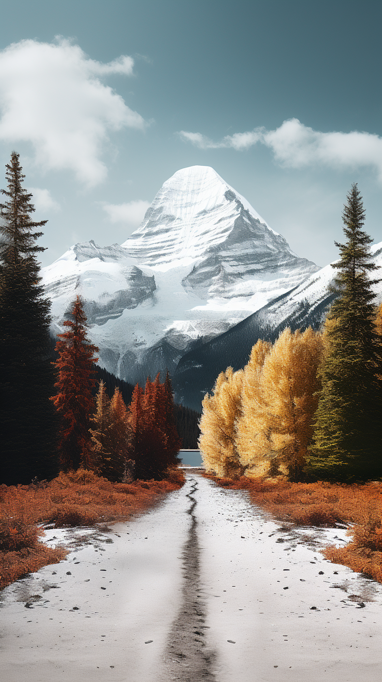 Majestic snow-capped mountain with vibrant autumn trees and a winding path under a clear blue sky.