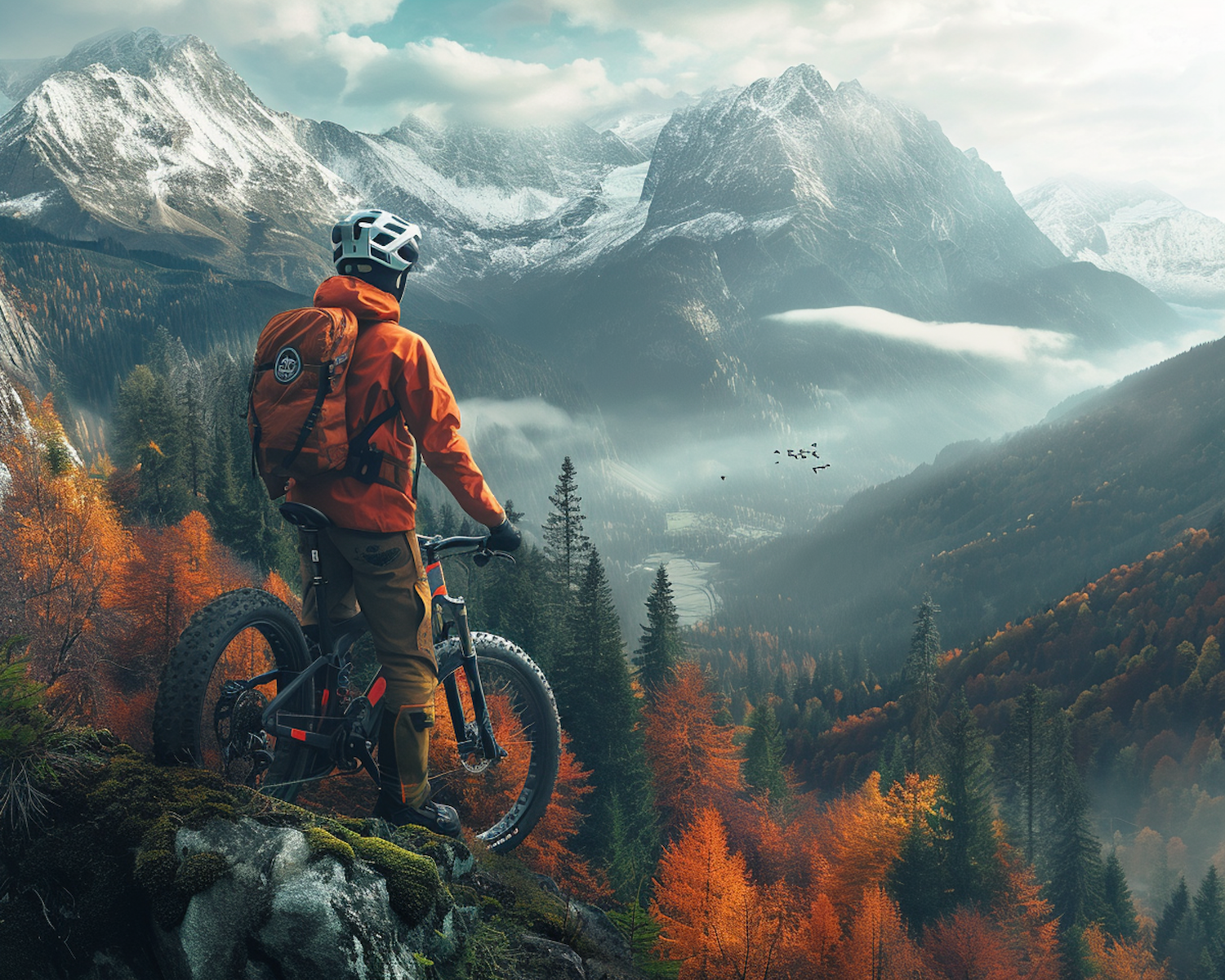 Mountain biker in orange gear overlooks stunning autumn landscape with snow-capped peaks and vibrant foliage.