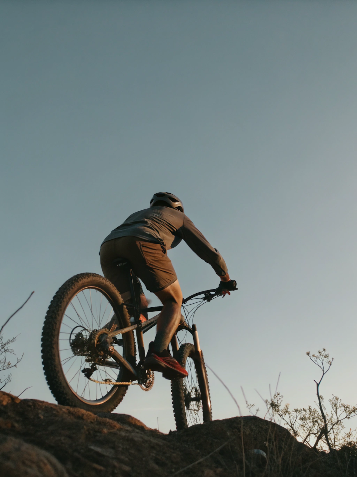 A mountain biker rides uphill on rocky terrain at sunset, showcasing adventure and effort against a golden sky.