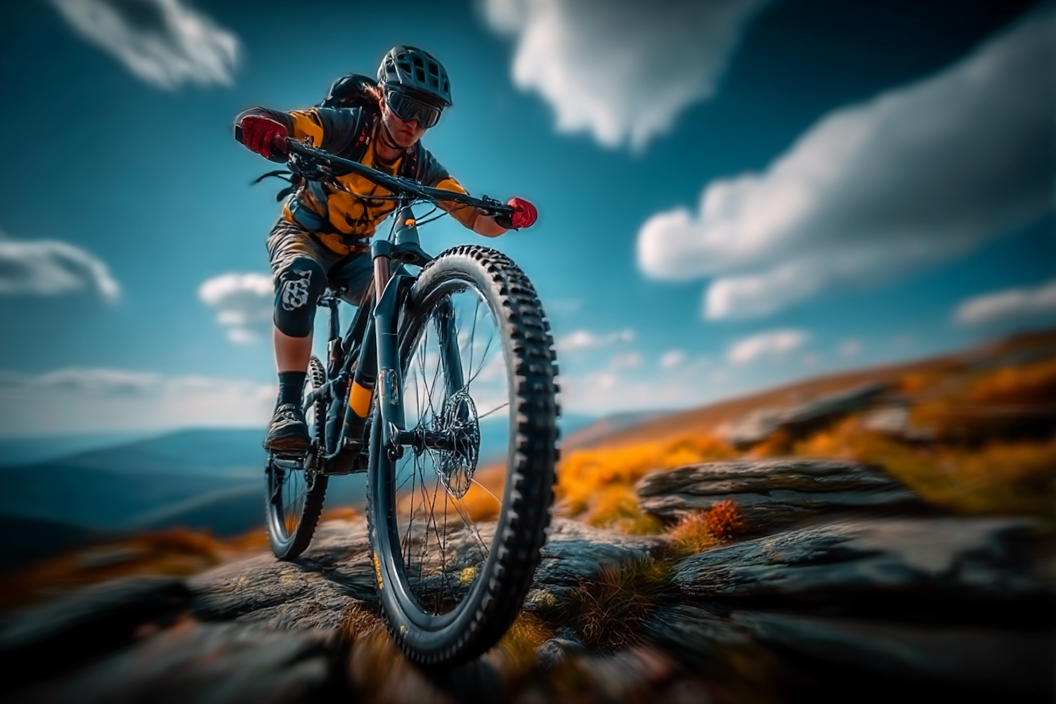 A mountain biker rides over rocky terrain under a vibrant sky, showcasing adventure and the thrill of outdoor sports.