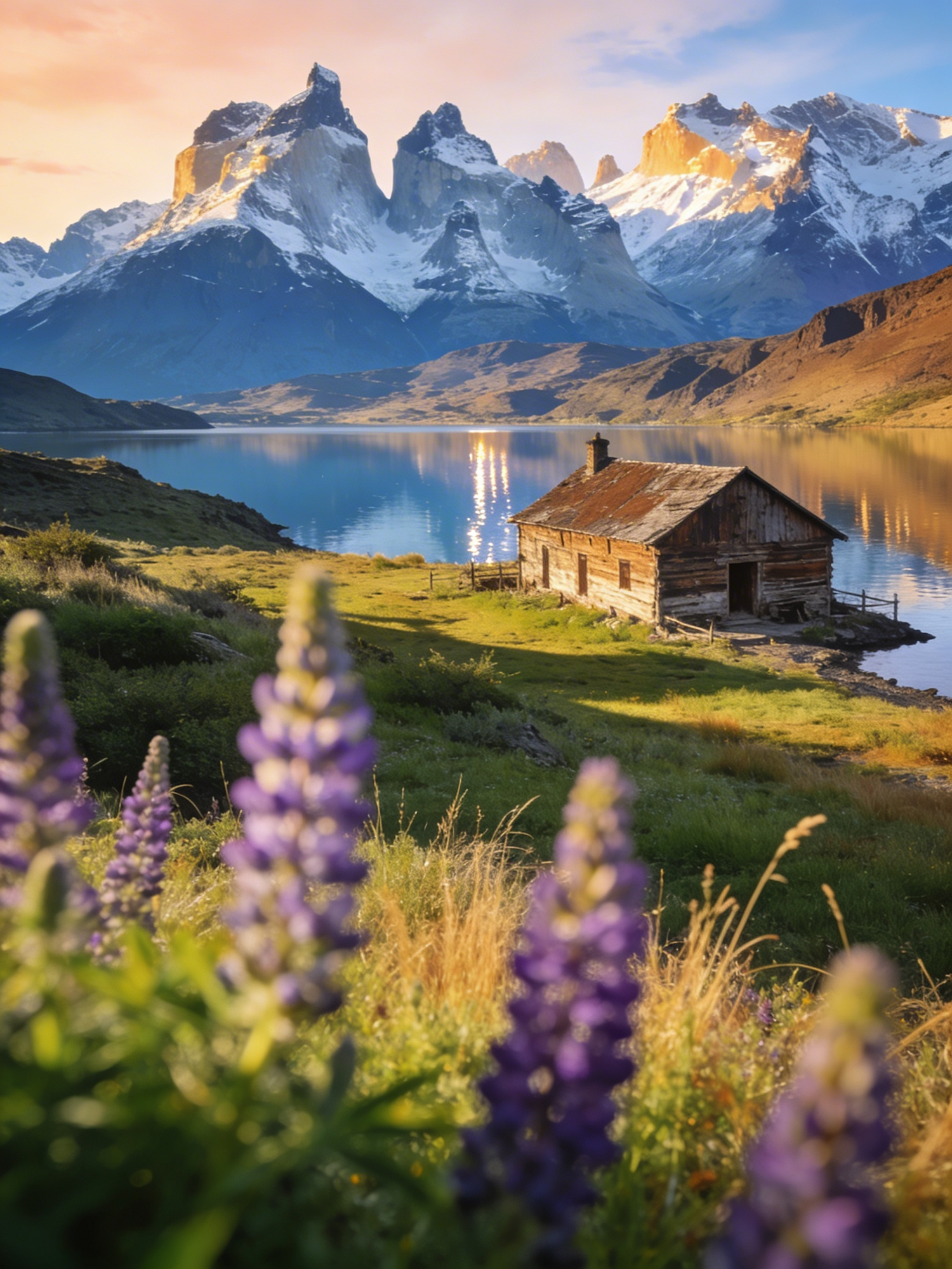 A rustic cabin by a tranquil lake, surrounded by vibrant lupines and majestic snow-capped mountains under a warm, glowing sky.