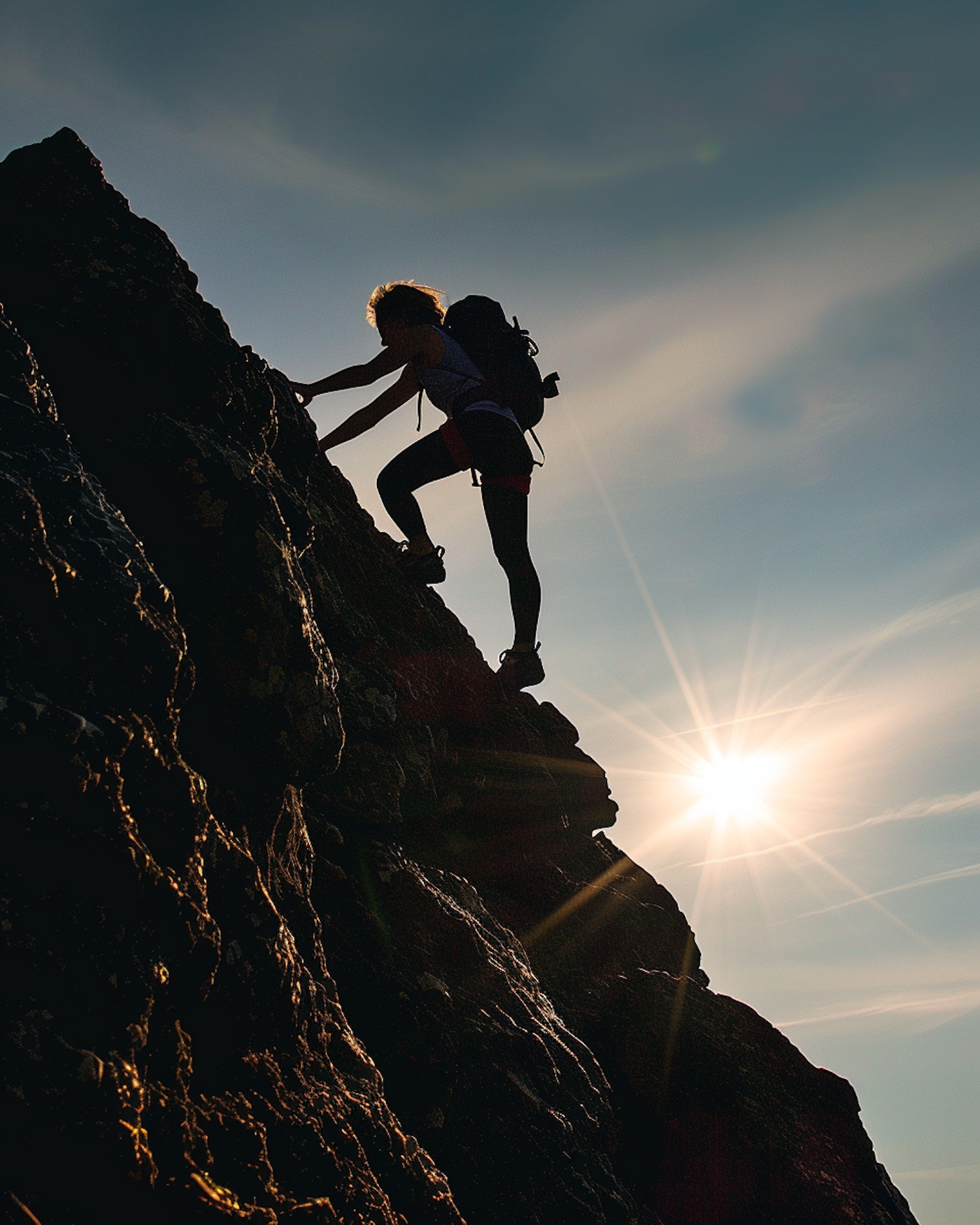 Silhouette of a climber scaling a steep rock face with the sun setting in the background, creating a dramatic and adventurous scene.