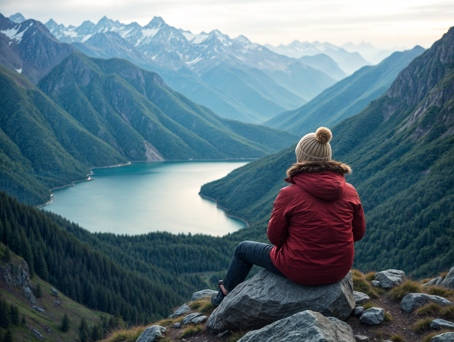 Person in red jacket sits on rock, overlooking a serene mountain lake and snow-capped peaks under an overcast sky.