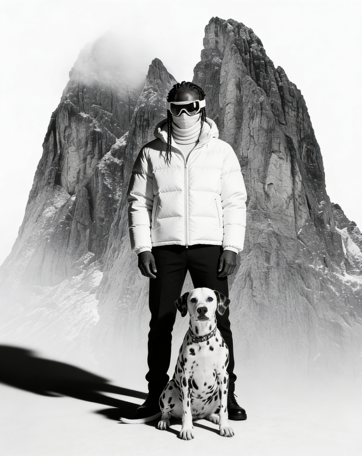 A stylish individual in winter gear stands with a Dalmatian against a dramatic mountain backdrop in this striking monochrome image.