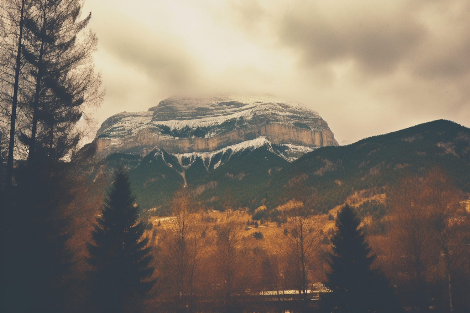 Majestic snow-capped mountain with forested slopes, framed by silhouetted trees under a dramatic cloudy sky.