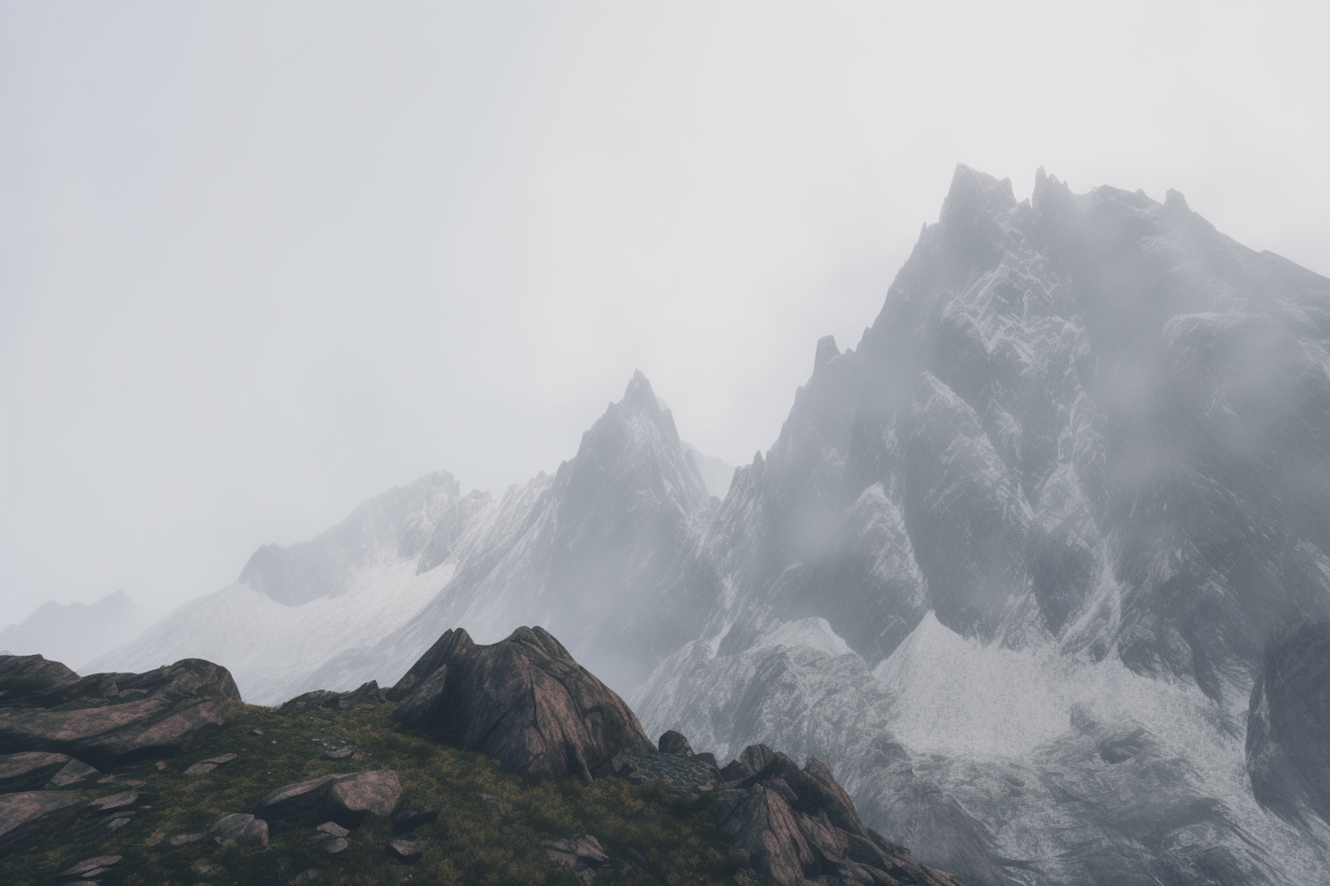 Misty mountain peaks with snow patches and rugged terrain create a dramatic and serene landscape, dominated by grays and whites.