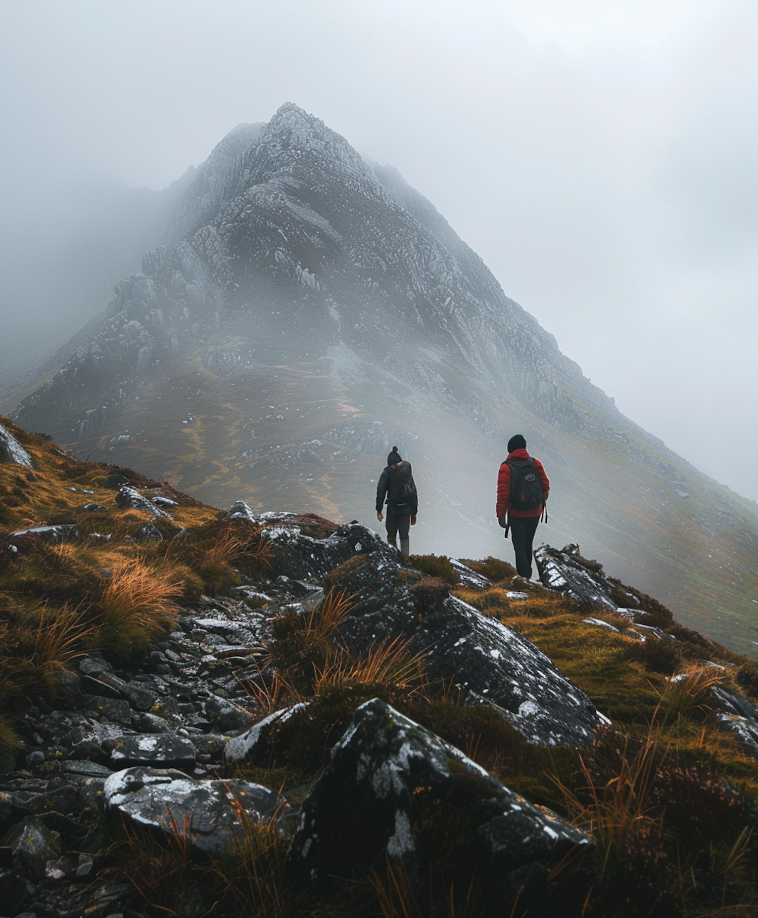 Two hikers on a misty mountain trail, surrounded by rugged terrain and golden grass, heading towards a dramatic, fog-covered peak.