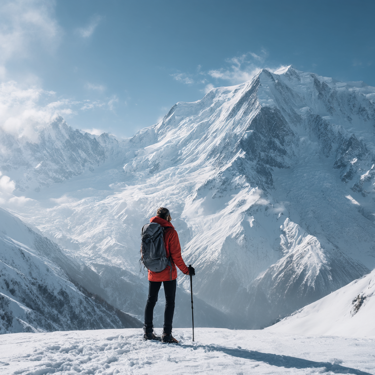 A hiker in a red jacket stands on a snowy ridge, admiring a majestic mountain peak under a clear blue sky.