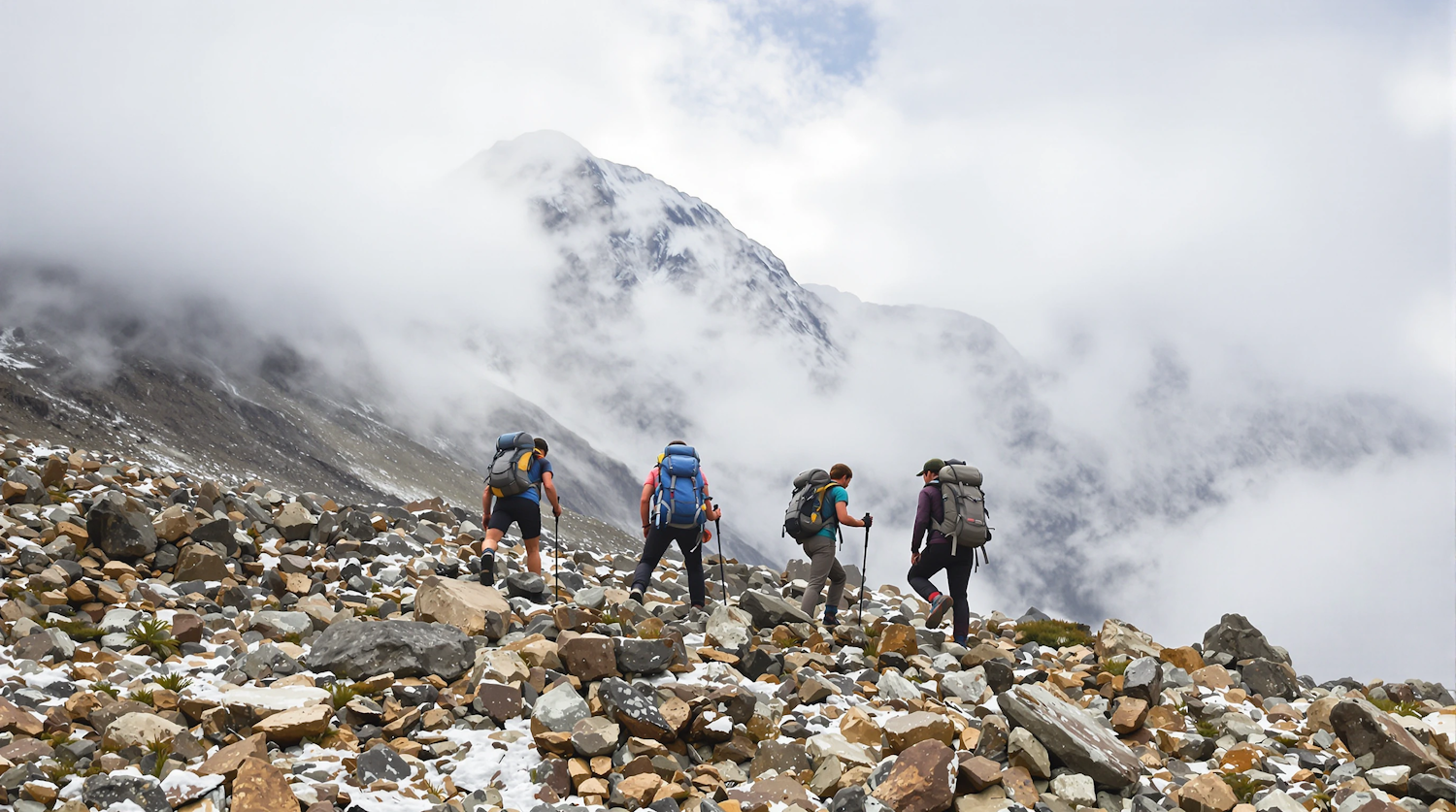 Four hikers with backpacks and poles trek through a rocky, snowy mountain landscape under an overcast sky.