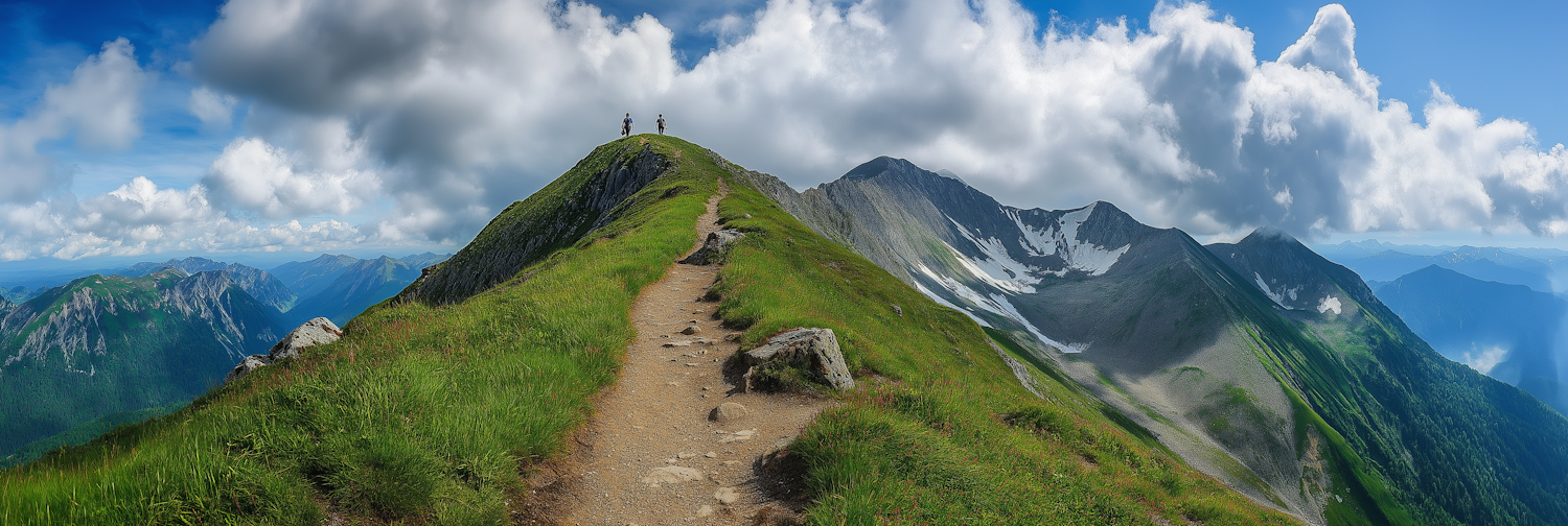 Two hikers on a grassy mountain ridge with a dirt trail, surrounded by rugged peaks, snow patches, and a vibrant blue sky with clouds.