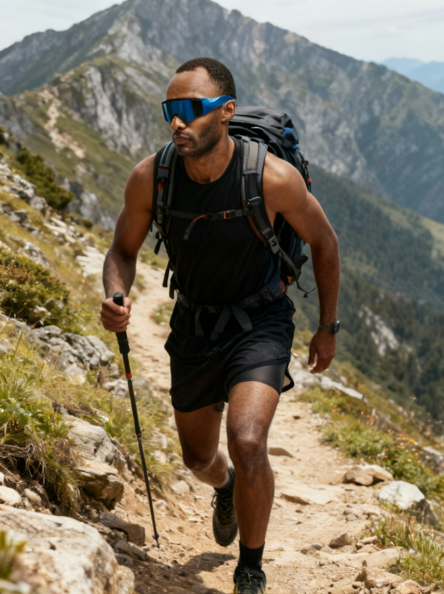 A hiker on a mountain trail, equipped with a backpack and trekking pole, surrounded by scenic peaks and greenery.