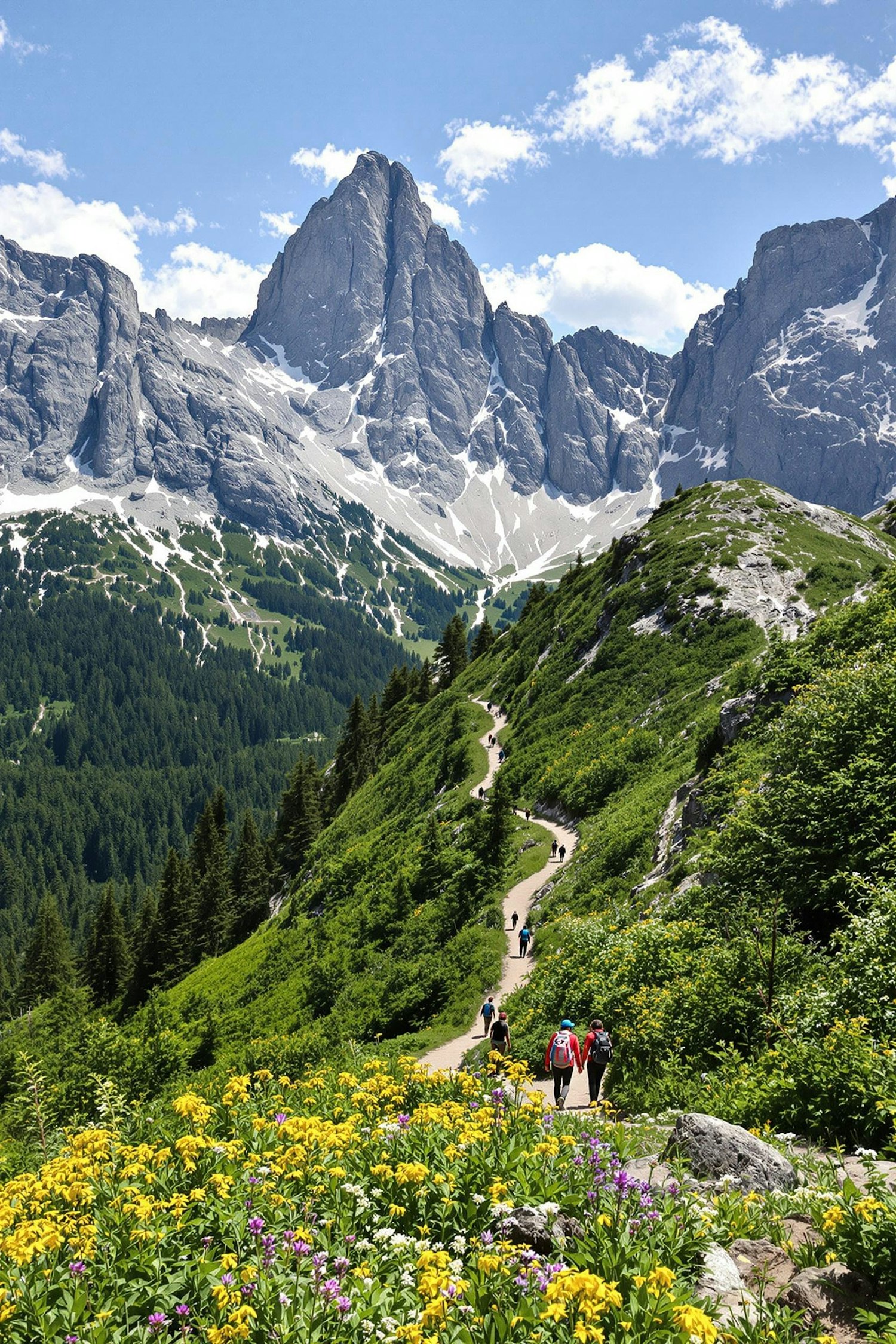 Hikers on a scenic trail surrounded by wildflowers, lush greenery, and towering snow-capped mountains under a bright blue sky.