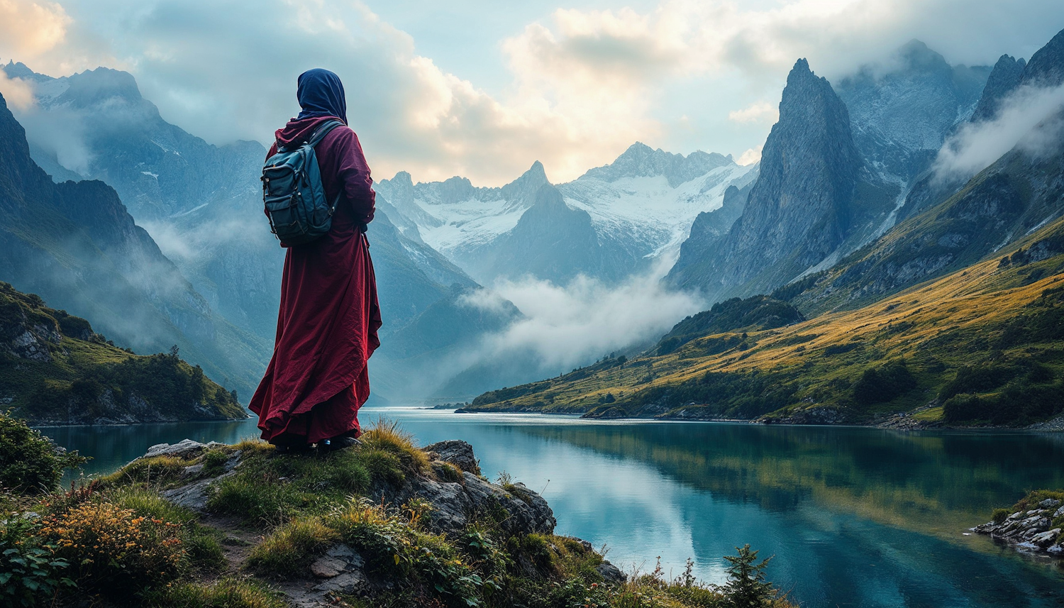 A person in a red robe and blue headscarf stands by a mountain lake, surrounded by misty peaks and serene reflections.