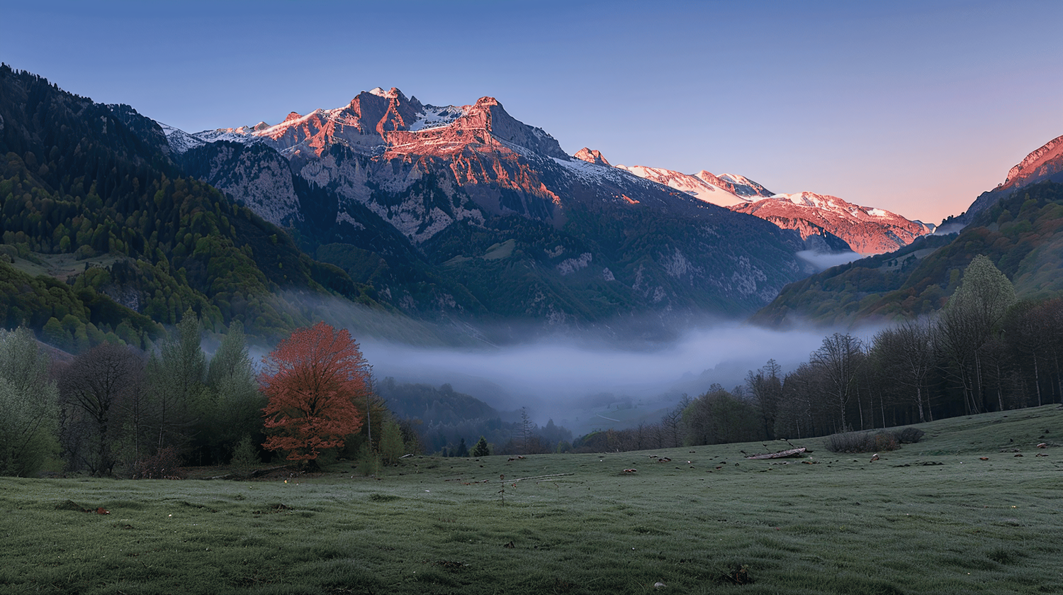 Majestic mountain landscape at dawn with pink-hued peaks, lush green valley, and misty atmosphere. Striking red-leaved tree stands out.