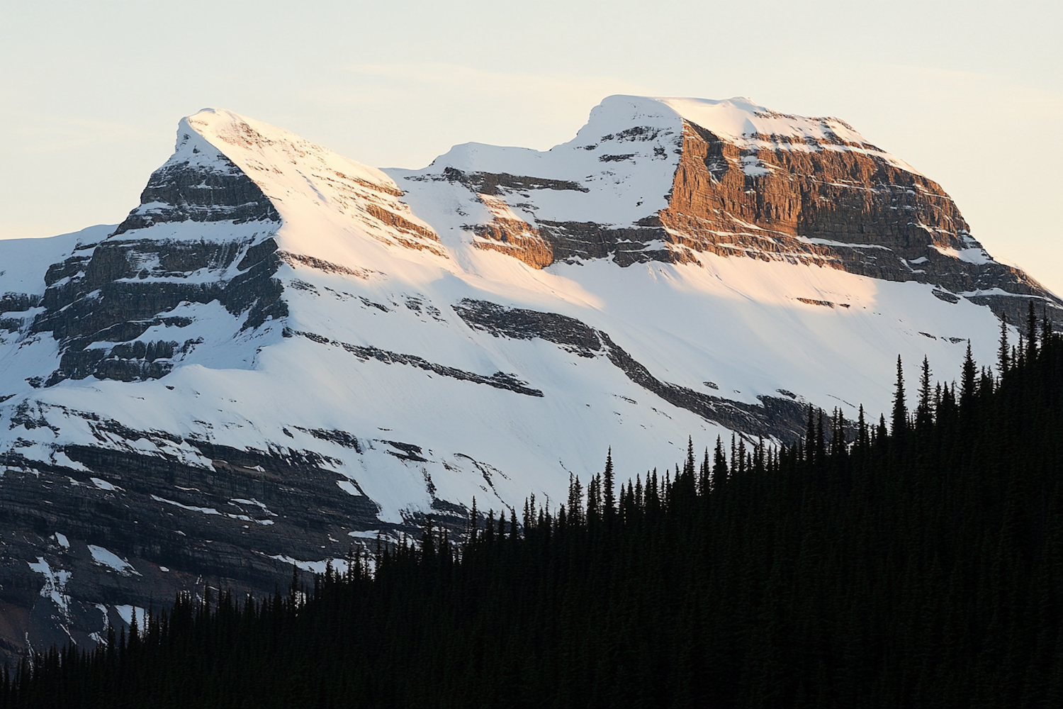 Snow-capped mountains at sunset with golden light, rugged peaks, and a dense coniferous forest in the foreground.