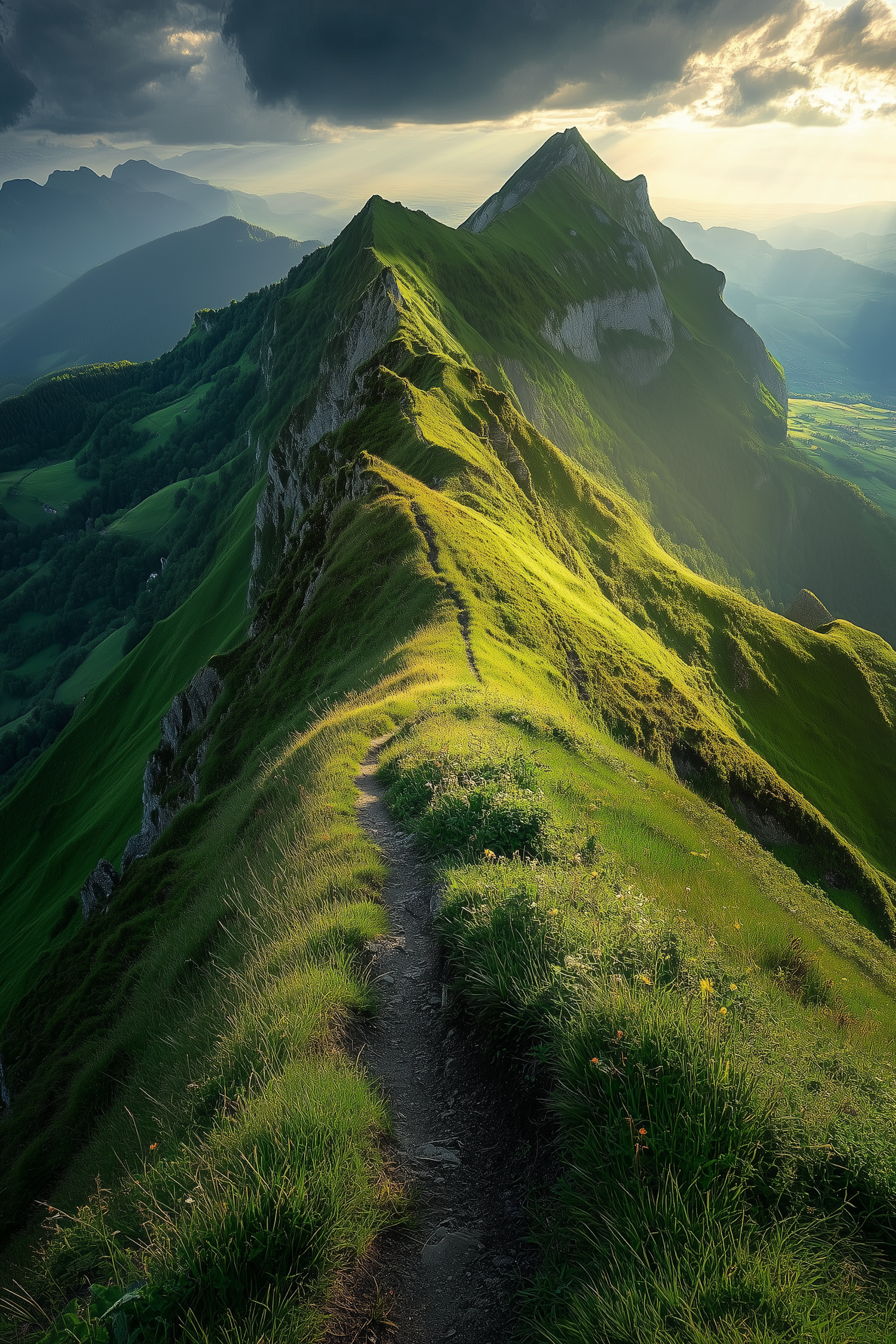Stunning mountain ridge with lush green grass, dramatic clouds, and a winding path leading to a distant peak under warm sunlight.