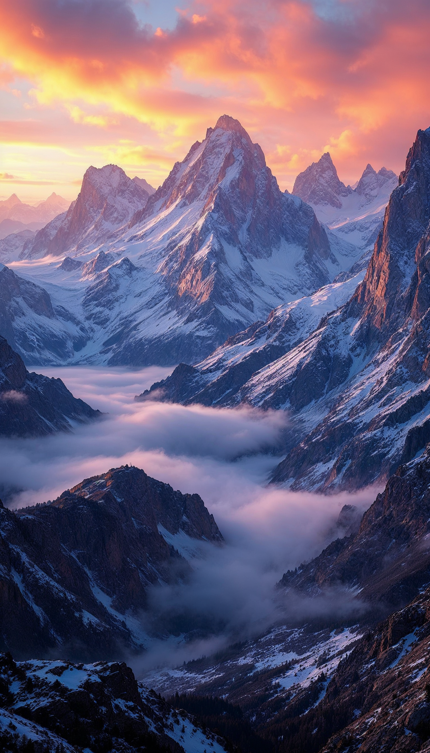 Breathtaking view of snow-capped mountains at sunrise, with vibrant skies and misty valleys creating a serene and majestic landscape.